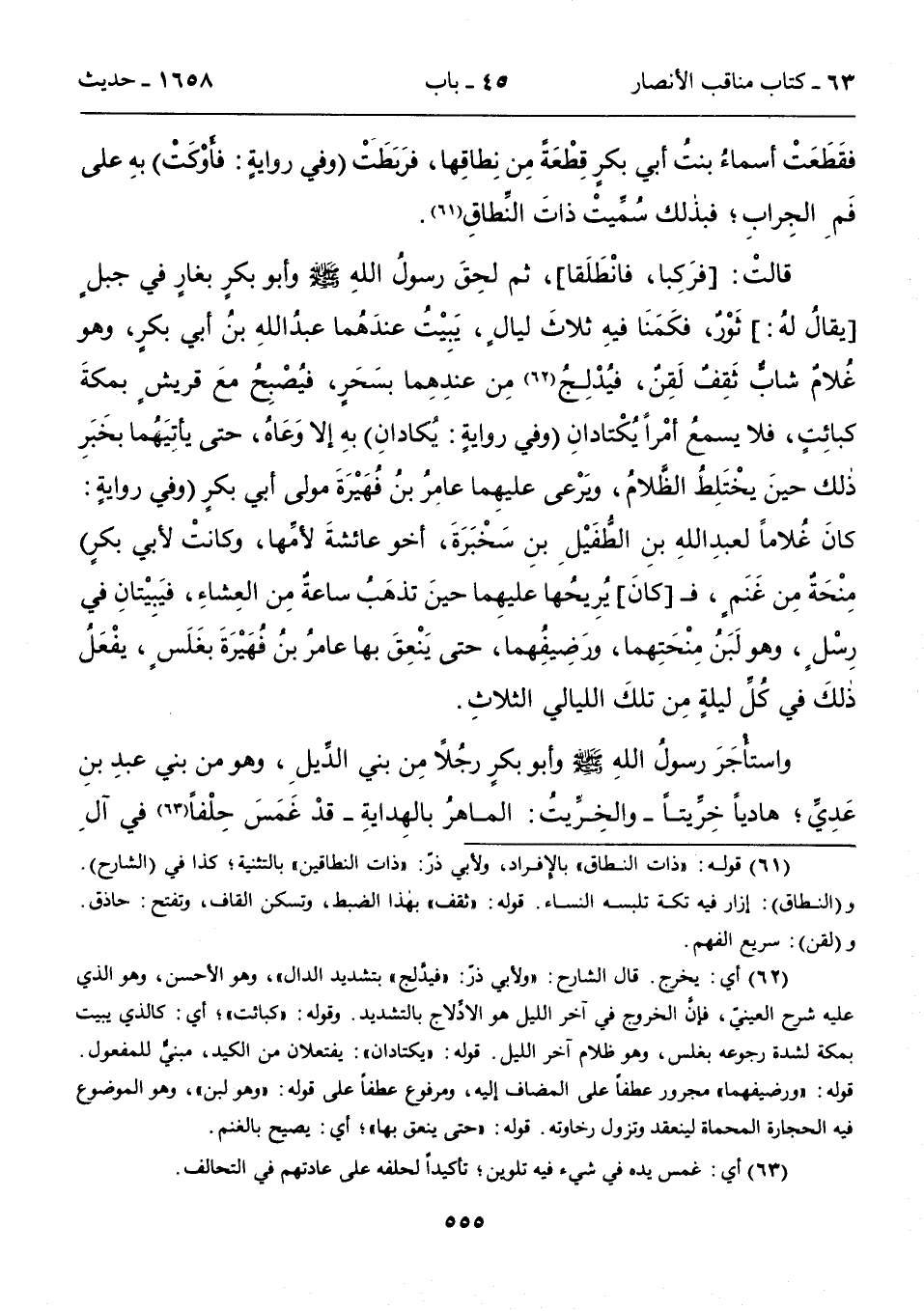 قالتْ: [فرَكبا، فانْطَلَقا]، ثم لحِقَ رسولُ اللهِ - صلى الله عليه وسلم - وأبو بكرٍ بغارٍ في جبلٍ [يقالُ لهُ:] ثَوْرٌ، فكَمَنَا فيهِ ثلاثَ ليالٍ، يَبِيْتُ عندَهُما عبدُ اللهِ بنُ أبي بكرٍ، وهو غُلامٌ شابٌ ثَقِفٌ لَقِنٌ، فيُدْلِجُ (62) مِن عندِهِما بسَحَرٍ، فيُصْبِحُ معَ قريشٍ بمكةَ كبائِتٍ، فلا يسمعُ أمْراً يُكْتادانِ (وفي روايةٍ: يُكادانِ) بهِ إلا وَعَاهُ، حتى يأتيَهُما بخَبَرِ ذلك حينَ يخْتَلِطُ الظَّلامُ، ويَرْعى عليهما عامِرُ بنُ فُهَيْرَةَ مولى أبي بكرٍ (وفي روايةٍ: كانَ غُلاماً لعبدِ اللهِ بنِ الطُّفَيْلِ بنِ سَخْبَرَةَ، أخو عائشةَ لأمَها، وكانتْ لأبي بكرٍ) مِنْحَةٌ مِن غَنَم، ف [كانَ]، يُرِيحُها عليهِما حينَ تذهَبُ ساعةٌ مِن العِشاءِ، فيَبِيْتانِ في رِسْلٍ، وهو لَبَنُ مِنْحَتِهما، ورَضِيفُهما، حتى يَنعِقَ بها عامرُبنُ فُهَيْرَةَ بغَلَسٍ، يفْعَلُ ذلكَ في كُلِّ ليلةٍ مِن تلكَ الليالي الثلاثِ.