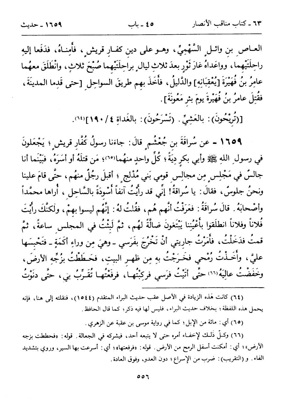 1659 - عن سُراقَةَ بنِ جُعْشُمٍ قالَ: جاءَنا رسولُ كُفَّارِ قريشٍ؛ يَجْعَلونَ في رسولِ اللهِ - صلى الله عليه وسلم - وأبى بكرٍ دِيَةً؛ كُلِّ واحدٍ منهُما (65)؛ مَن قتلَهُ أو أسَرةُ، فبَيْنَما أنا جالسٌ في مَجْلِسٍ مِن مجالِسِ قومي بَني مُدْلجٍ؛ أقبلَ رجُلٌ منهُم، حتّى قامَ علينا ونحنُ جلوسٌ، فقالَ: يا سُراقةُ! إنِّي قد رأَيْتُ آنفاً أسودةً بالسَّاحِلِ، أُراها محمَّداً وأصْحابَهُ. قالَ سُراقَةُ: فعَرَفْتُ أنَّهم هُم، فقُلتُ لهُ: إنَّهُم ليسوا بهِمْ، ولكنَّكَ رأَيْتَ فُلاناً وفلاناً انطلَقوا بأَعْيُنِنا يَبْتَغونَ ضالَّةً لهُم، ثمَّ لَبِثْتُ في المجلسِ ساعةً، ثمَّ قمتُ فدَخَلْتُ، فأمَرْتُ جارِيتي أنْ تَخْرُجَ بفَرَسي -وهيَ مِن وراءِ أكَمَةٍ- فتَحْبِسَها عليَّ، وأخَذْتُ رُمْحي فخَرَجْتُ به مِن ظهرِ البيتِ، فحَطَطْتُ بزُجِّهِ الأرضَ، وخَفَضْتُ عالِيَهُ (66) حتَّى أتَيْت فرَسي فركِبْتُها، فرفَعْتُها تُقَرِّب بي، حتَّى دنَوْتُ