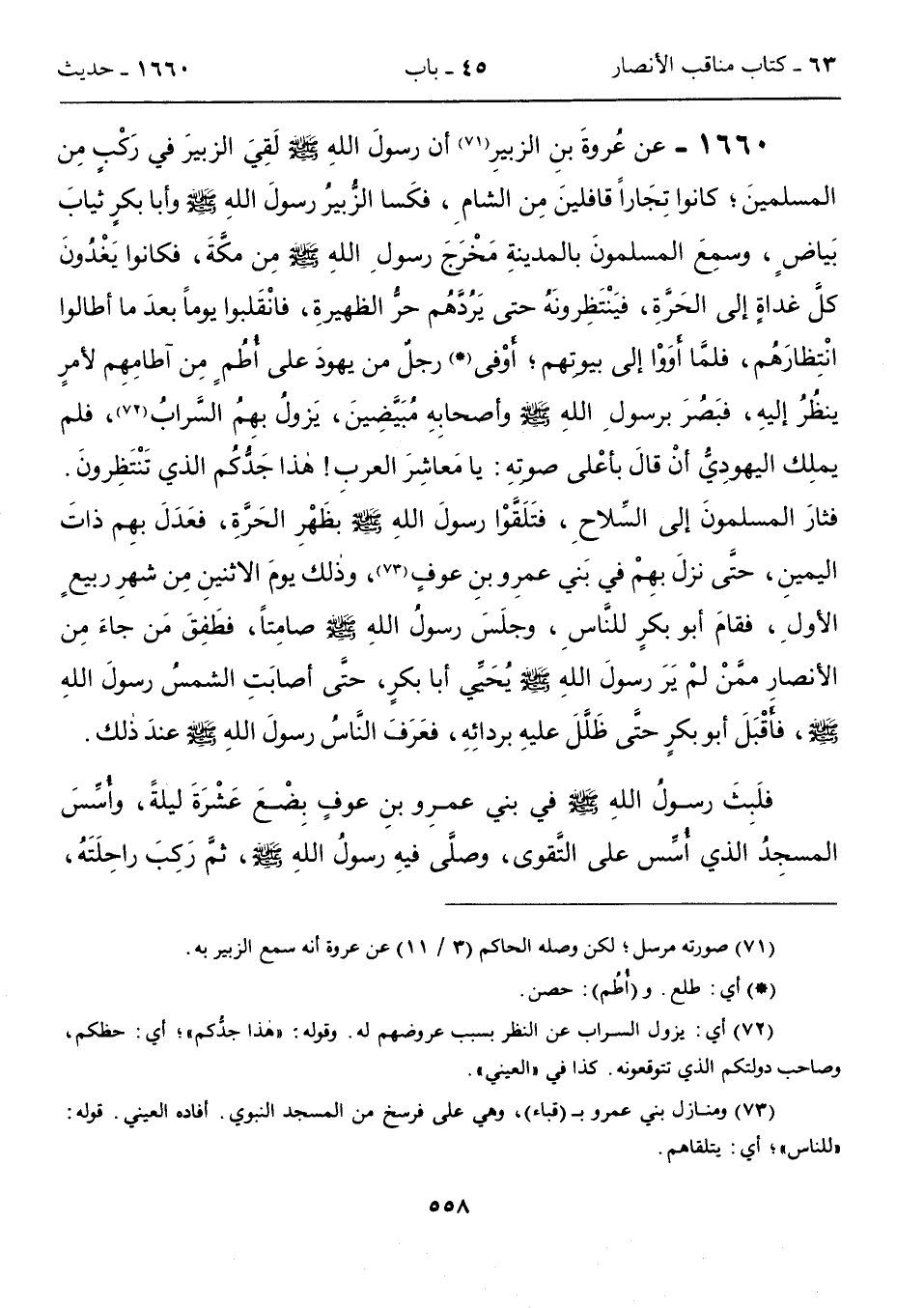 1660 - عن عُروةَ بنِ الزبيرِ (71) أن رسولَ اللهِ - صلى الله عليه وسلم - لَقِيَ الزبيرَ في رَكْبٍ مِن المسلمينَ؛ كانوا تِجَاراً قافلينَ مِن الشامِ، فكَسا الزُّبيرُ رسولَ اللهِ - صلى الله عليه وسلم - وأبا بكرٍ ثيابَ بَياضٍ، وسمِعَ المسلمونَ بالمدينةِ مَخْرَجَ رسولِ اللهِ - صلى الله عليه وسلم - مِن مكَّةَ، فكانوا يَغْدُونَ كلَّ غداةٍ إلى الحَرَّةِ، فيَنْتَظِرونَهُ حتى يَرُدَّهُم حرُّ الظهيرةِ، فانْقَلبوا يوماً بعدَ ما أطالوا انْتِظارَهُم، فلمَّا أووْا إلى بيوتهم؛ أوْفى (*) رجلٌ من يهودَ على أُطُمٍ مِن آطامِهِم لأمرٍ ينظُرُ إليهِ، فبَصُرَ برسولِ اللهِ - صلى الله عليه وسلم - وأصحابِهِ مُبَيَّضِينَ، يَزولُ بهِمُ السَّرابُ (72)، فلم يملِك اليهودِىُّ أنْ قالَ بأعْلى صوتهِ: يا مَعاشِرَ العربِ! هذا جَدُّكُم الذي تَنْتَظِرونَ. فثارَ المسلمونَ إلى السِّلاحِ، فتَلَقَّوْا رسولَ اللهِ - صلى الله عليه وسلم - بظَهْرِ الحَرَّةِ، فعَدَلَ بهِم ذاتَ اليمينِ، حتَّى نزلَ بهِمْ في بَني عمرِو بنِ عوفٍ (73)، وذلك يومَ الاثنينِ مِن شهرِ ربيعٍ الأولِ، فقامَ أبو بكرٍ للنَّاسِ، وجلَسَ رسولُ اللهِ - صلى الله عليه وسلم - صامِتاً، فطَفِقَ مَن جاءَ مِن الأنصار ممَّنْ لمْ يَرَ رسولَ اللهِ - صلى الله عليه وسلم - يُحَيِّى أبا بكرٍ، حتَّى أصابَتِ الشمسُ رسولَ اللهِ - صلى الله عليه وسلم -، فأَقبَلَ أبو بكرٍ حتَّى ظَلَّلَ عليهِ بردائِهِ، فعَرَفَ النَّاسُ رسولَ اللهِ - صلى الله عليه وسلم - عندَ ذلك.