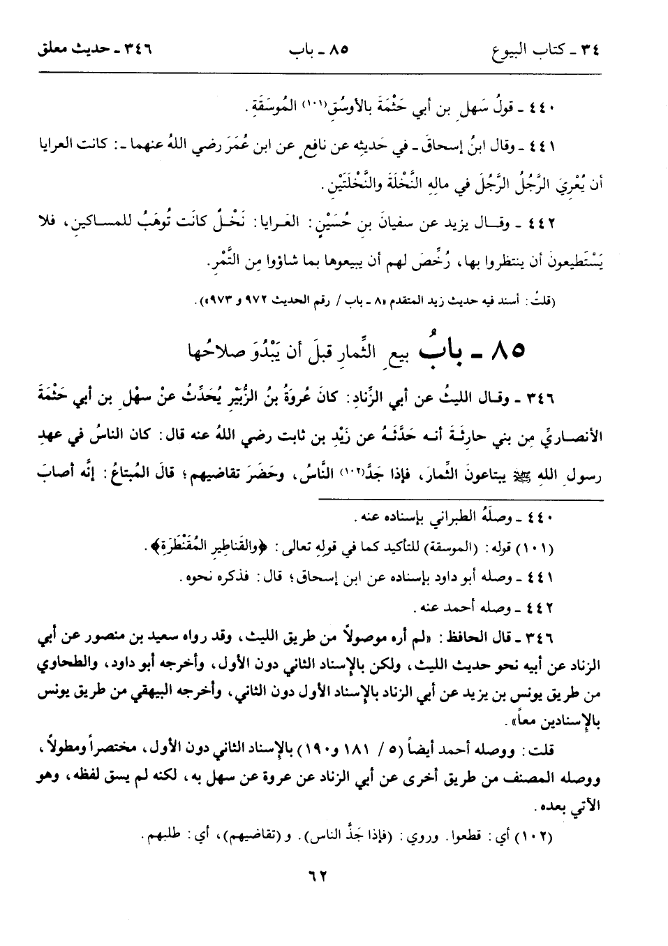 346 - وقال الليثُ عن أبي الزِّنادِ: كانَ عُروَةُ بنُ الزُّبيرِ يُحَدِّثُ عنْ سهْلِ بن أبي حَثْمَةَ الأنصاريِّ من بني حارِثَةَ أنه حَدَّثَهُ عن زَيْدِ بن ثابت رضي اللهُ عنه قال: كان الناسُ في عهدِ رسولِ اللهِ - صلى الله عليه وسلم - يبتاعونَ الثِّمارَ، فإذا جَدَّ (102) النَّاسُ، وحَضَرَ تقاضيهم؛ قالَ المُبتاعُ: إنَّه أصابَ