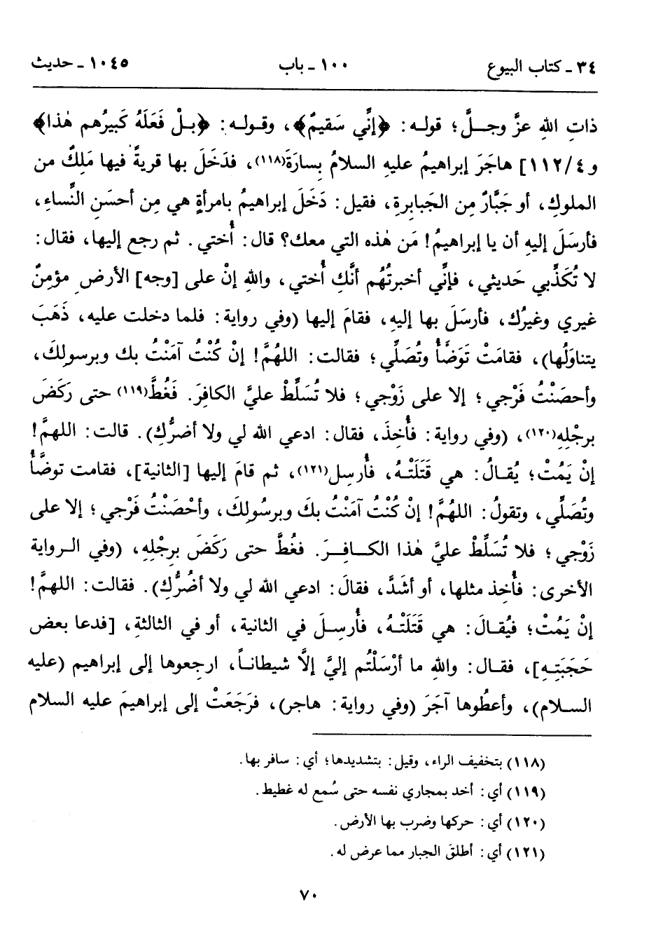 ذاتِ الله عزَّ وجلَّ؛ قوله: {إنِّي سَقيمٌ}، وقوله: {بلْ فَعَلَهُ كَبيرُهم هذا} و4/ 112] هاجَرَ إبراهيمُ عليهِ السلامُ بِسارَةَ (118)، فدَخَلَ بها قريةً فيها مَلِكٌ من الملوكِ، أو جَبَّارٌ مِن الجَبابِرةِ، فقيل: دَخَلَ إبراهيمُ بامرأةٍ هي مِن أحسَنِ النِّساءِ، فأرسَلَ إليهِ أن يا إبراهيمُ! مَن هذه التي معك؟ قال: أُختي. ثم رجع إليها، فقال: لا تُكَذَّبي حَديثي، فإنِّي أخبرتُهُم أنَّكِ أُختي، والله إنْ على [وجه] الأرضِ مؤمِنٌ غيري وغيرُك، فأرسَلَ بها إليهِ، فقامَ إليها (وفي روايةٍ: فلما دخلت عليه، ذَهَبَ يتناوَلُها)، فقامَتْ تَوَضَّأُ وتُصَلِّي؛ فقالت: اللهُمَّ! إنْ كُنْتُ آمَنْتُ بك وبرسُولِكَ، وأحصَنْتُ فَرْجي؛ إلا على زَوْجي؛ فلا تُسَلِّطْ عليَّ هذا الكافِرَ. فَغُطَّ (119) حتى رَكَضَ برِجْلِهِ (12)، (وفي روايةٍ: فأُخِذَ، فقال: ادعي الله لي ولا أضرُّكِ). قالت: اللهمَّ! إنْ يَمُتْ؛ يُقالُ؛ هي قَتَلَتْهُ، فأُرسِل (121)، ثم قامَ إليها [الثانية]، فقامت توضَّأُ وتُصَلِّي، وتقولُ: اللهُمَّ! إنْ كُنْتُ آمَنْتُ بكَ وبرسُولِكَ، وأحْصَنْتُ فَرْجي؛ إلا على زَوْجي؛ فلا تُسَلِّطْ عليَّ هذا الكافِرَ. فغُطَّ حتى رَكَضَ برِجْلِهِ، (وفي الرواية الأخرى: فأُخِذ مثلها، أو أشَدَّ، فقالَ: ادعي الله لي ولا أضُرُّكِ). فقالت: اللهمَّ! إنْ يَمُتْ؛ فيُقالَ: هي قَتَلَتْهُ، فأُرسِلَ في الثانية، أو في الثالثةِ، [فدعا بعض حَجَبَتِهِ]، فقال: واللهِ ما أرْسَلْتُم إليَّ إلاَّ شيطاناً، ارجِعوها إلى إبراهيم (عليه السلام)، وأعطُوها آجَرَ (وفي روايةٍ: هاجر)، فرَجَعَتْ إلى إبراهيمَ عليه السلام