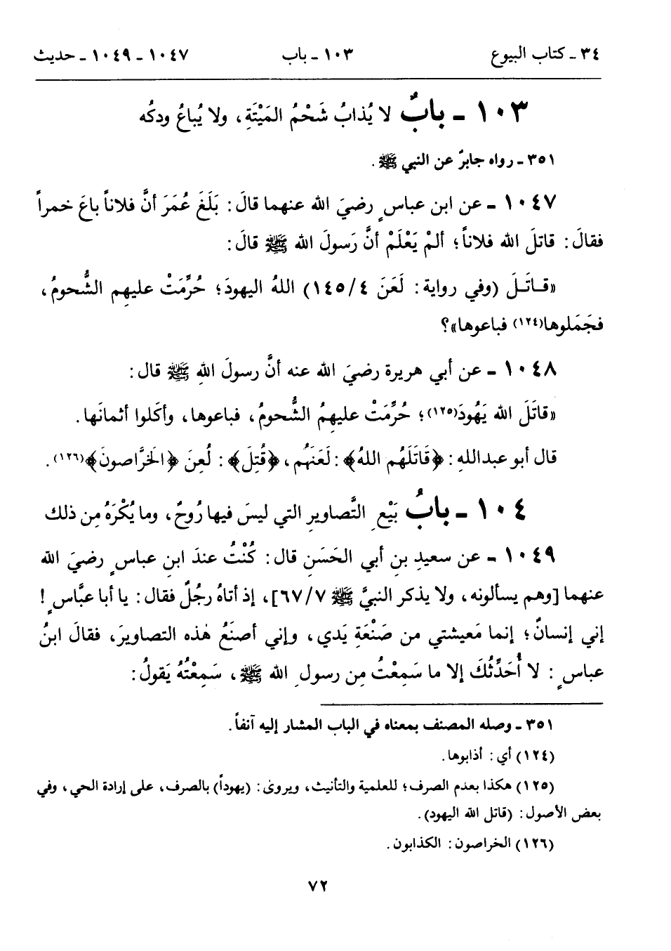 "قاتَلَ (وفي روايةٍ: لَعَنَ 4/ 145) اللهُ اليهودَ؛ حُرِّمَتْ عليهِم الشُّحومُ، فجَمَلوها (124) فباعوها"؟