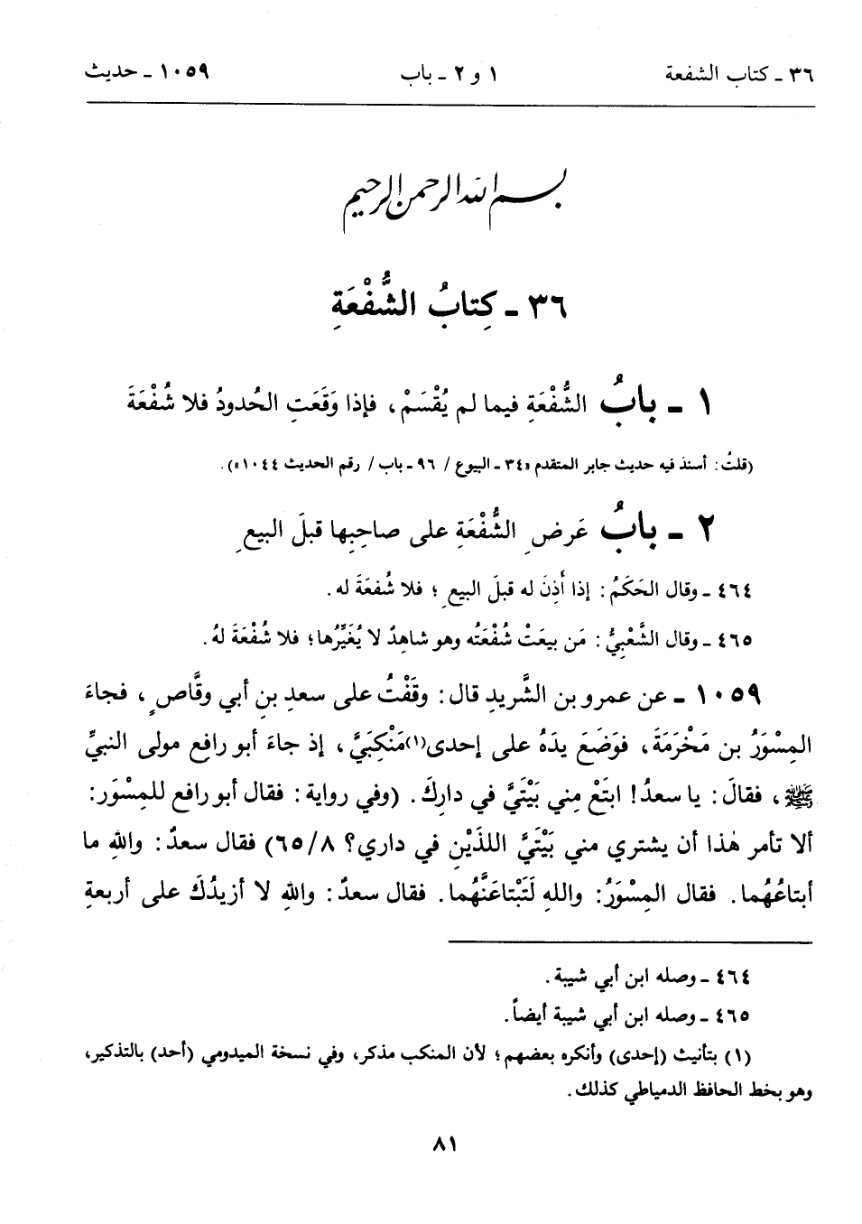 1059 - عن عمرو بن الشَّريدِ قال: وقَفْتُ على سعدِ بنِ أبي وقَّاصٍ، فجاءَ المِسْوَرُ بن مَخْرَمَةَ، فوَضَعَ يدَهُ على إحدى (1) مَنْكِبَيَّ، إذ جاءَ أبو رافِع مولى النبيِّ - صلى الله عليه وسلم -، فقالَ: يا سعدُ! ابتَعْ مِني بَيْتَيَّ في دارِكَ. (وفي روايةٍ: فقال أبو رافع للمِسْوَر: ألا تأمر هذا أن يشتري مني بَيْتَيَّ اللذَيْنِ في داري؟ 8/ 65) فقال سعدٌ: واللهِ ما أبتاعُهُما. فقال المِسْوَرُ: واللهِ لَتَبْتاعَنَّهُما. فقال سعدٌ: واللهِ لا أزيدُكَ على أربعةِ