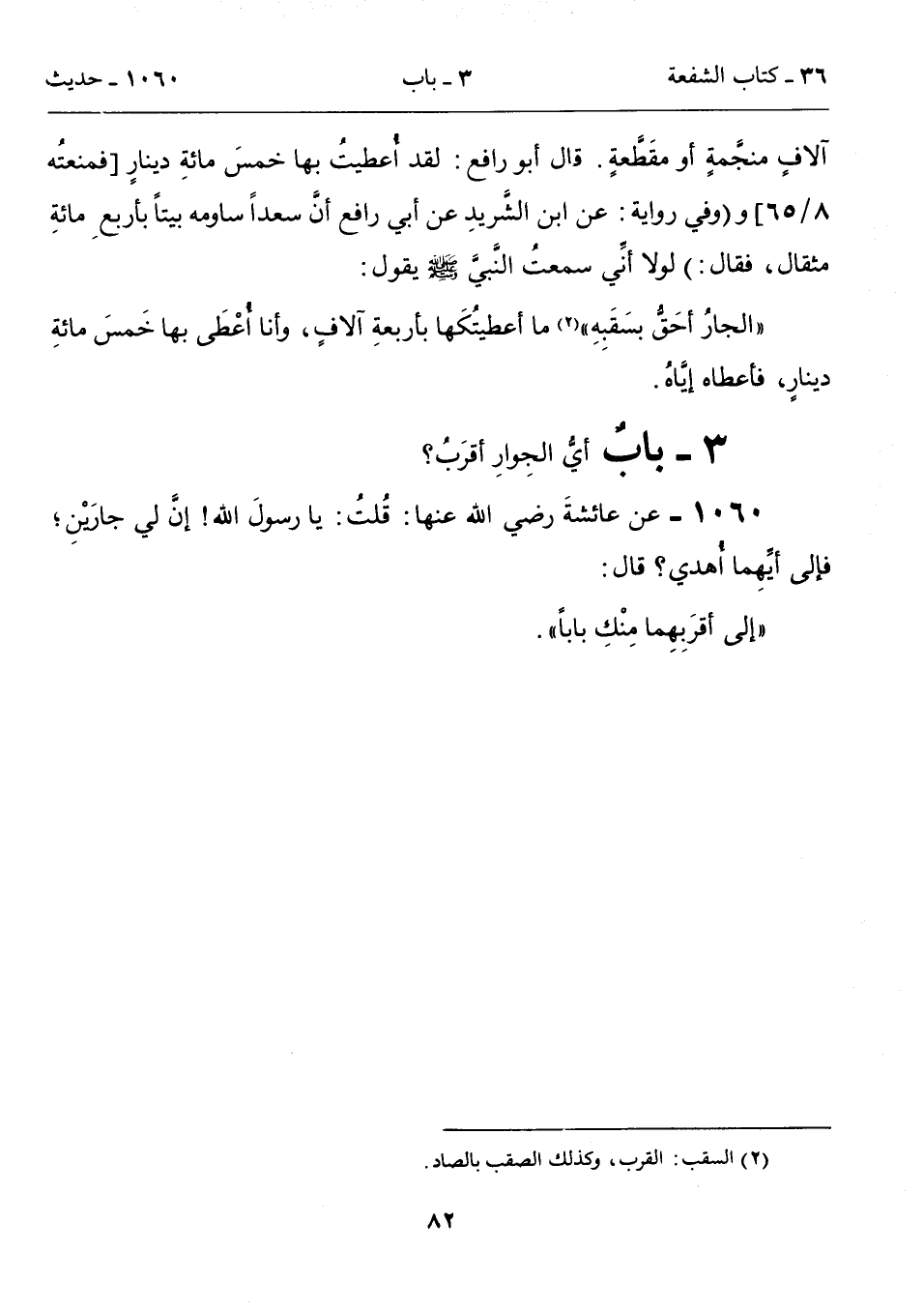 "الجارُ أحَقُّ بسَقَبِهِ" (2) ما أعطيتُكَها بأربعةِ آلافٍ، وأنا أُعْطَى بها خَمسَ مائةِ دينارٍ، فأعطاه إيَّاهُ.