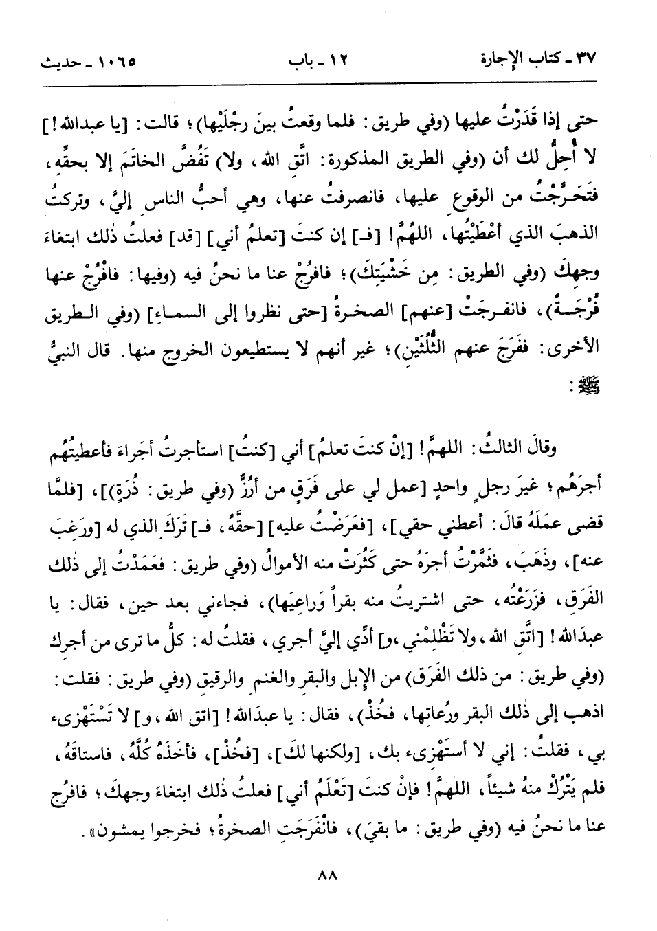 وقالَ الثالثُ: اللهمَّ! [إنْ كنتَ تعلمُ] أني [كنتُ] استأجرتُ أجَراءَ فأعطيتُهُم أجرَهُم؛ غيرَ رجلٍ واحدٍ [عمل لي على فَرَقٍ من أرُزٍّ (وفي طريق: ذُرَةٍ)]، [فلمَّا قضى عمَلَهُ قالَ: أعطني حقي]، [فعَرَضْتُ عليه] [حقَّهُ، فـ] تَرَكَ الذي له [ورَغِبَ عنه]، وذَهَبَ، فثَمَّرْتُ أجرَهُ حتى كَثُرَتْ منه الأموالُ (وفي طريق: فعَمَدْتُ إلى ذلك الفَرَقِ، فزَرَعْتُه، حتى اشتريتُ منه بقراً وَراعِيَها)، فجاءني بعد حين، فقال: يا عبدَ الله! [اتَّقِ الله، ولا تَظْلِمْني، و] أدِّي إليَّ أجري، فقلتُ له: كلُّ ما ترى من أجرِك (وفي طريق: من ذلك الفَرَق) من الإِبل والبقرِ والغنمِ والرقيقِ (وفي طريق: فقلت: اذهب إلى ذلك البقر ورُعاتِها، فخُذْ)، فقال: يا عبدَ الله! [اتق الله، و] لا تَسْتَهْزىء بي، فقلتُ: إني لا أستَهْزِىء بك، [ولكنها لكَ]، [فخُذْ]، فأخَذَهُ كُلَّهُ، فاستاقَهُ، فلم يَتْرُكْ منهُ شيئاً، اللهمَّ! فإنْ كنتَ [تَعْلَمُ أني] فعلت ذلك ابتغاءَ وجهكَ، فافرُج عنا ما نحنُ فيه (وفي طريق: ما بقيَ)، فانْفَرَجَتِ الصخرةُ، فخرجوا يمشون".