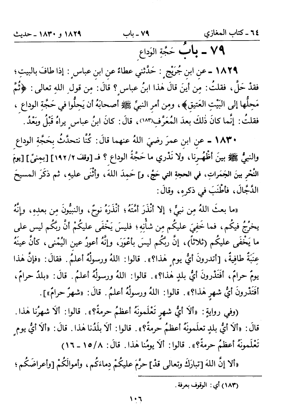 1830 - عنِ ابنِ عمرَ رضيَ اللهُ عنهما قالَ: كُنَّا نَتَحَدَّثُ بِحَجَّةِ الْوَدَاعِ وَالنَّبِىُّ - صلى الله عليه وسلم - بَيْنَ أَظْهُرِنَا، وَلاَ نَدْرِى مَا حَجَّةُ الْوَدَاعِ؟ ف [وقفَ 2/ 192] [بمِنىَّ] [يومَ النَّحْرِ بينَ الجمراتِ , فى الحجةِ التي حَجَّ , و] حَمِدَ اللَّهَ، وَأَثْنَى عَلَيْهِ، ثُمَّ ذَكَرَ الْمَسِيحَ الدَّجَّالَ، فَأَطْنَبَ فِى ذِكْرِهِ، وَقَالَ: