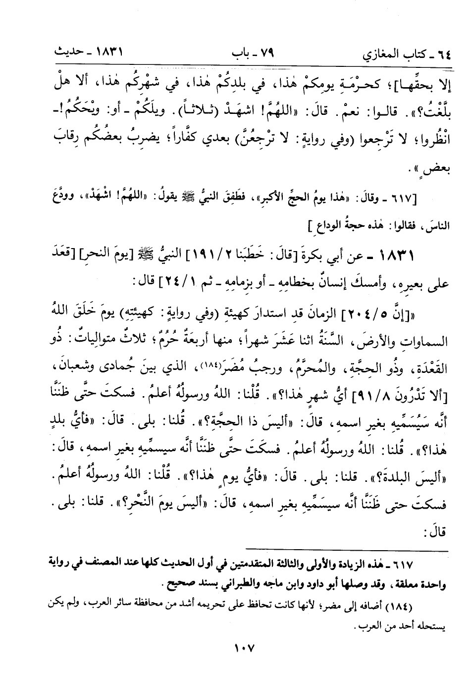 " [إنَّ 5/ 204] الزَّمَانُ قَدِ اسْتَدَارَ كَهَيْئَتِهِ (وفي روايةٍ: كهيئتِه) يَوْمَ خَلَقَ اللَّهُ السَّمَوَاتِ وَالأَرْضَ، السَّنَةُ اثْنَا عَشَرَ شَهْرًا؛ مِنْهَا أَرْبَعَةٌ حُرُمٌ؛ ثَلاَثٌ مُتَوَالِيَاتٌ: ذُو الْقَعَدَةِ، وَذُو الْحَجَّةِ، وَالْمُحَرَّمُ، وَرَجَبُ مُضَرَ (184)، الَّذِى بَيْنَ جُمَادَى وَشَعْبَانَ، [ألا تَدْرُون 8/ 91] أَىُّ شَهْرٍ هَذَا؟». قُلْنَا: اللَّهُ وَرَسُولُهُ أَعْلَمُ. فَسَكَتَ حَتَّى ظَنَنَّا أَنَّهُ سيُسَمِّيهِ بِغَيْرِ اسْمِهِ قَالَ: «أَلَيْسَ ذَا الْحَجَّةِ». قُلْنَا: بَلَى. قَالَ: «فَأَىُّ بَلَدٍ هَذَا». قُلْنَا: اللَّهُ وَرَسُولُهُ أَعْلَمُ. فَسَكَتَ حَتَّى ظَنَنَّا أَنَّهُ سَيُسَمِّيهِ بِغَيْرِ اسْمِهِ، قَالَ: «أَلَيْسَ الْبَلْدَةَ؟». قُلْنَا بَلَى. قَالَ: «فَأَىُّ يَوْمٍ هَذَا؟». قُلْنَا: اللَّهُ وَرَسُولُهُ أَعْلَمُ. فَسَكَتَ حَتَّى ظَنَنَّا أَنَّهُ سَيُسَمِّيهِ بِغَيْرِ اسْمِهِ، قَالَ: «أَلَيْسَ يَوْمَ النَّحْرِ؟». قُلْنَا بَلَى. قالَ: