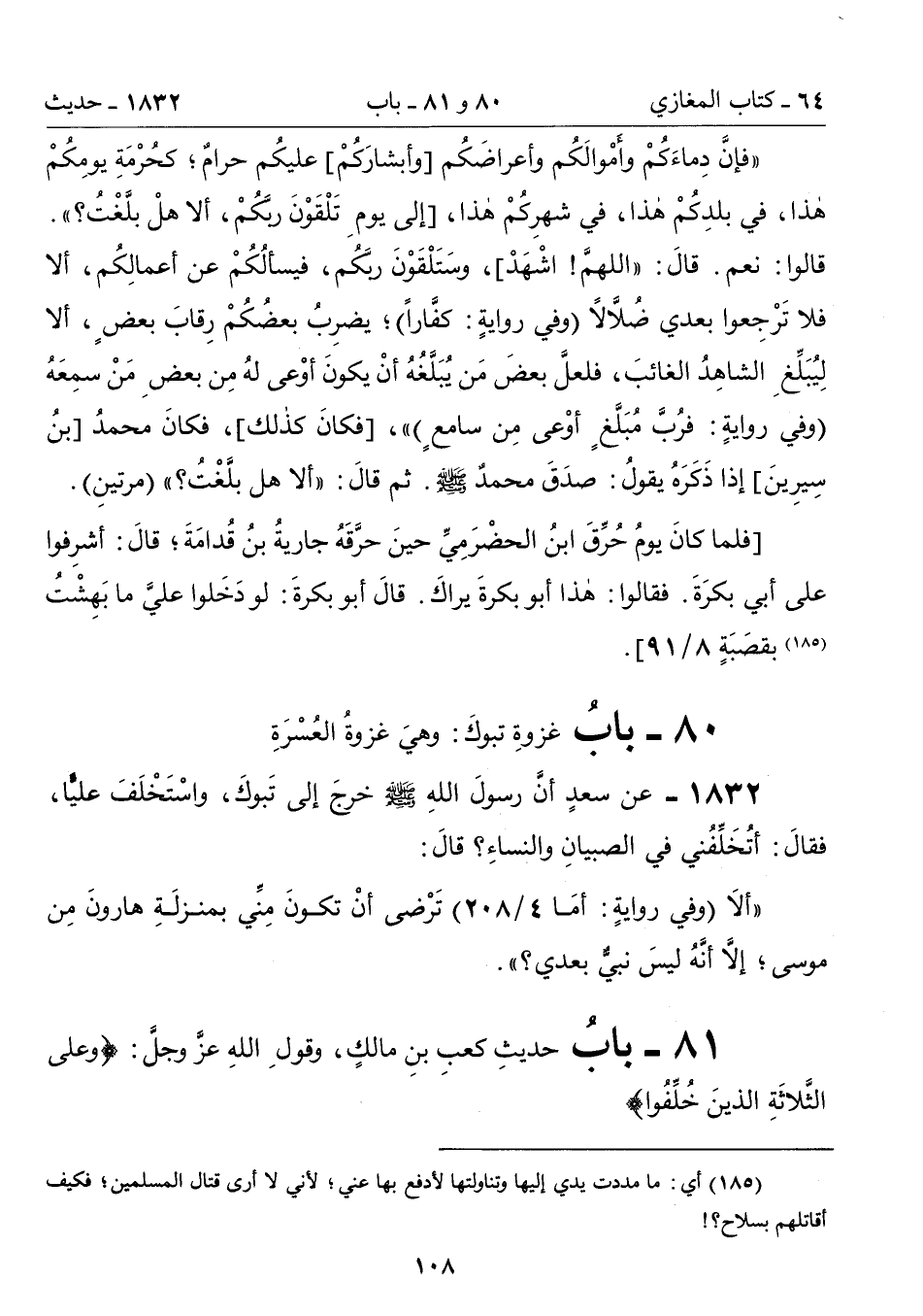 81 - بابُ حديثِ كعبِ بن مالكٍ، وقولِ اللهِ عزَّ وجلَّ: {وعلى الثَّلاثَةِ الذينَ خُلِّفُوا}