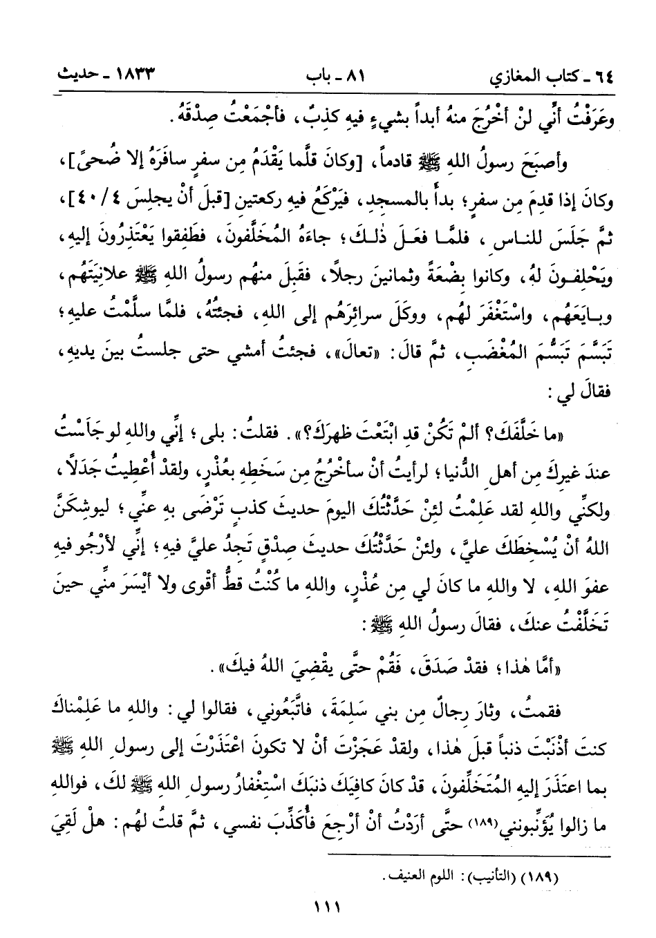"مَا خَلَّفَكَ؟ أَلَمْ تَكُنْ قَدِ ابْتَعْتَ ظَهْرَكَ؟». فَقُلْتُ: بَلَى؛ إِنِّى وَاللَّهِ لَوْ جَلَسْتُ عِنْدَ غَيْرِكَ مِنْ أَهْلِ الدُّنْيَا؛ لَرَأَيْتُ أَنْ سَأَخْرُجُ مِنْ سَخَطِهِ بِعُذْرٍ، وَلَقَدْ أُعْطِيتُ جَدَلاً، وَلَكِنِّى وَاللَّهِ لَقَدْ عَلِمْتُ لَئِنْ حَدَّثْتُكَ الْيَوْمَ حَدِيثَ كَذِبٍ تَرْضَى بِهِ عَنِّى؛ لَيُوشِكَنَّ اللَّهُ أَنْ يُسْخِطَكَ عَلَىَّ، وَلَئِنْ حَدَّثْتُكَ حَدِيثَ صِدْقٍ تَجِدُ عَلَىَّ فِيهِ؛ إِنِّى لأَرْجُو فِيهِ عَفْوَ اللَّهِ، لاَ وَاللَّهِ مَا كَانَ لِي مِنْ عُذْرٍ، وَاللَّهِ مَا كُنْتُ قَطُّ أَقْوَى وَلاَ أَيْسَرَ مِنِّى حِينَ تَخَلَّفْتُ عَنْكَ، فَقَالَ رَسُولُ اللَّهِ - صلى الله عليه وسلم -: