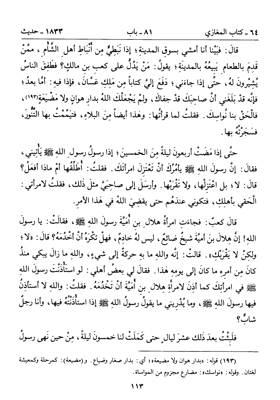 قَالَ كَعْبٌ: فَجَاءَتِ امْرَأَةُ هِلاَلِ بْنِ أُمَيَّةَ رَسُولَ اللَّهِ - صلى الله عليه وسلم -، فَقَالَتْ: يَا رَسُولَ اللَّهِ! إِنَّ هِلاَلَ بْنَ أُمَيَّةَ شَيْخٌ ضَائِعٌ، لَيْسَ لَهُ خَادِمٌ، فَهَلْ تَكْرَهُ أَنْ أَخْدُمَهُ؟ قَالَ: «لاَ؛ وَلَكِنْ لاَ يَقْرَبْكِ». قَالَتْ: إِنَّهُ وَاللَّهِ مَا بِهِ حَرَكَةٌ إِلَى شَىْءٍ، وَاللَّهِ مَا زَالَ يَبْكِى مُنْذُ كَانَ مِنْ أَمْرِهِ مَا كَانَ إِلَى يَوْمِهِ هَذَا. فَقَالَ لِي بَعْضُ أَهْلِى: لَوِ اسْتَأْذَنْتَ رَسُولَ اللَّهِ - صلى الله عليه وسلم - فِى امْرَأَتِكَ كَمَا أَذِنَ لاِمْرَأَةِ هِلاَلِ بْنِ أُمَيَّةَ أَنْ تَخْدُمَهُ. فَقُلْتُ: وَاللَّهِ لاَ أَسْتَأْذِنُ فِيهَا رَسُولَ اللَّهِ - صلى الله عليه وسلم -، وَمَا يُدْرِينِى مَا يَقُولُ رَسُولُ اللَّهِ - صلى الله عليه وسلم - إِذَا اسْتَأْذَنْتُهُ فِيهَا، وَأَنَا رَجُلٌ شَابٌّ؟