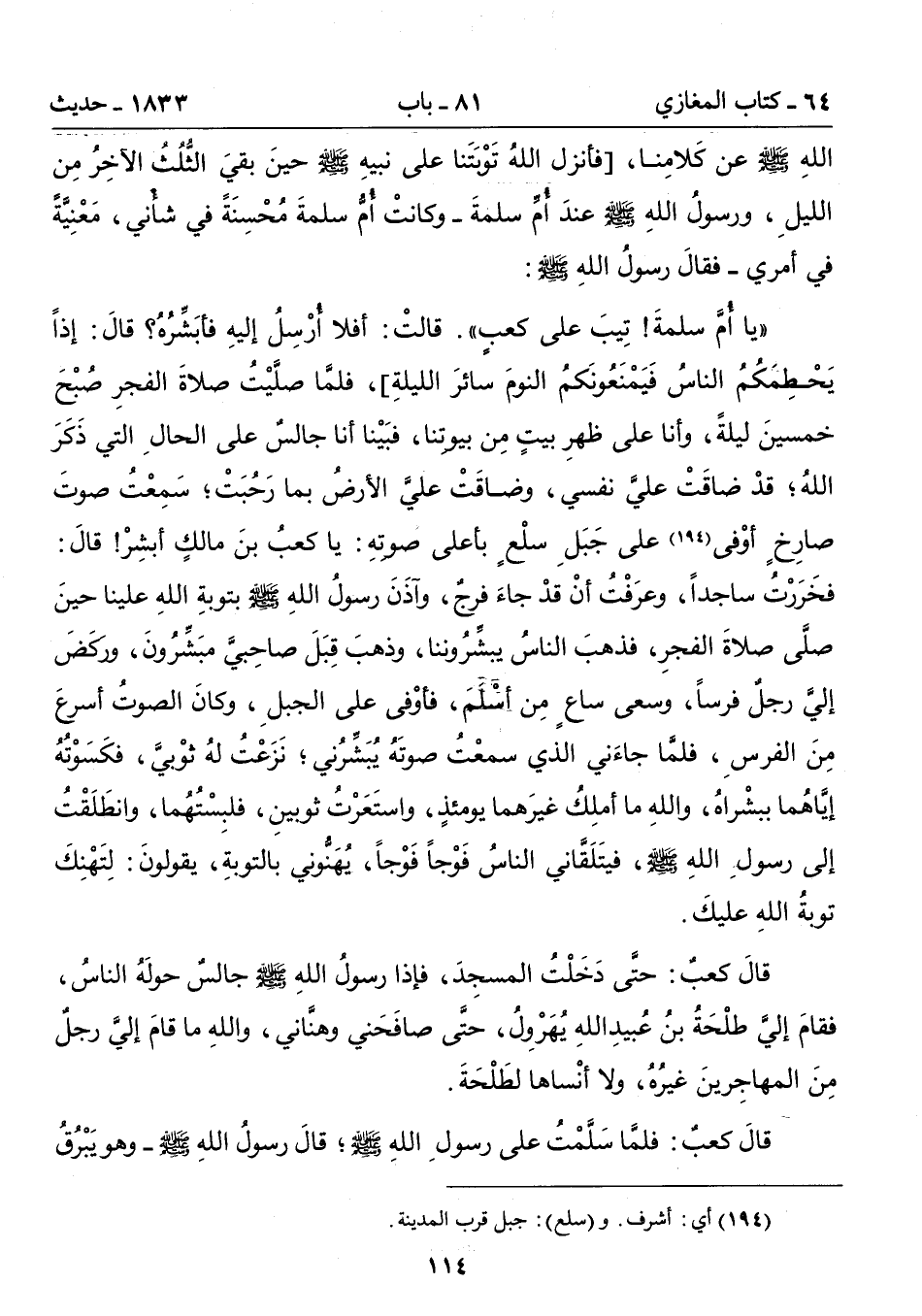 يَا أُمَّ سَلَمَةَ! تِيبَ عَلَى كَعْبٍ». قَالَتْ: أَفَلاَ أُرْسِلُ إِلَيْهِ فَأُبَشِّرَهُ؟ قَالَ: إِذًا يَحْطِمَكُمُ النَّاسُ فَيَمْنَعُونَكُمُ النَّوْمَ سَائِرَ اللَّيْلَةِ]، فَلَمَّا صَلَّيْتُ صَلاَةَ الْفَجْرِ صُبْحَ خَمْسِينَ لَيْلَةً، وَأَنَا عَلَى ظَهْرِ بَيْتٍ مِنْ بُيُوتِنَا، فَبَيْنَا أَنَا جَالِسٌ عَلَى الْحَالِ الَّتِى ذَكَرَ اللَّهُ؛ قَدْ ضَاقَتْ عَلَىَّ نَفْسِى، وَضَاقَتْ عَلَىَّ الأَرْضُ بِمَا رَحُبَتْ؛ سَمِعْتُ صَوْتَ صَارِخٍ أَوْفَى (194) عَلَى جَبَلِ سَلْعٍ بِأَعْلَى صَوْتِهِ: يَا كَعْبُ بْنَ مَالِكٍ، أَبْشِرْ! قَالَ: فَخَرَرْتُ سَاجِدًا، وَعَرَفْتُ أَنْ قَدْ جَاءَ فَرَجٌ، وَآذَنَ رَسُولُ اللَّهِ - صلى الله عليه وسلم - بِتَوْبَةِ اللَّهِ عَلَيْنَا حِينَ صَلَّى صَلاَةَ الْفَجْرِ، فَذَهَبَ النَّاسُ يُبَشِّرُونَنَا، وَذَهَبَ قِبَلَ صَاحِبَىَّ مُبَشِّرُونَ، وَرَكَضَ إِلَىَّ رَجُلٌ فَرَسًا، وَسَعَى سَاعٍ مِنْ أَسْلَمَ، فَأَوْفَى عَلَى الْجَبَلِ، وَكَانَ الصَّوْتُ أَسْرَعَ مِنَ الْفَرَسِ، فَلَمَّا جَاءَنِى الَّذِى سَمِعْتُ صَوْتَهُ يُبَشِّرُنِى؛ نَزَعْتُ لَهُ ثَوْبَىَّ، فَكَسَوْتُهُ إِيَّاهُمَا بِبُشْرَاهُ، وَاللَّهِ مَا أَمْلِكُ غَيْرَهُمَا يَوْمَئِذٍ، وَاسْتَعَرْتُ ثَوْبَيْنِ، فَلَبِسْتُهُمَا، وَانْطَلَقْتُ إِلَى رَسُولِ اللَّهِ - صلى الله عليه وسلم -، فَيَتَلَقَّانِى النَّاسُ فَوْجًا فَوْجًا، يُهَنُّونِى بِالتَّوْبَةِ، يَقُولُونَ: لِتَهْنِكَ تَوْبَةُ اللَّهِ عَلَيْكَ.