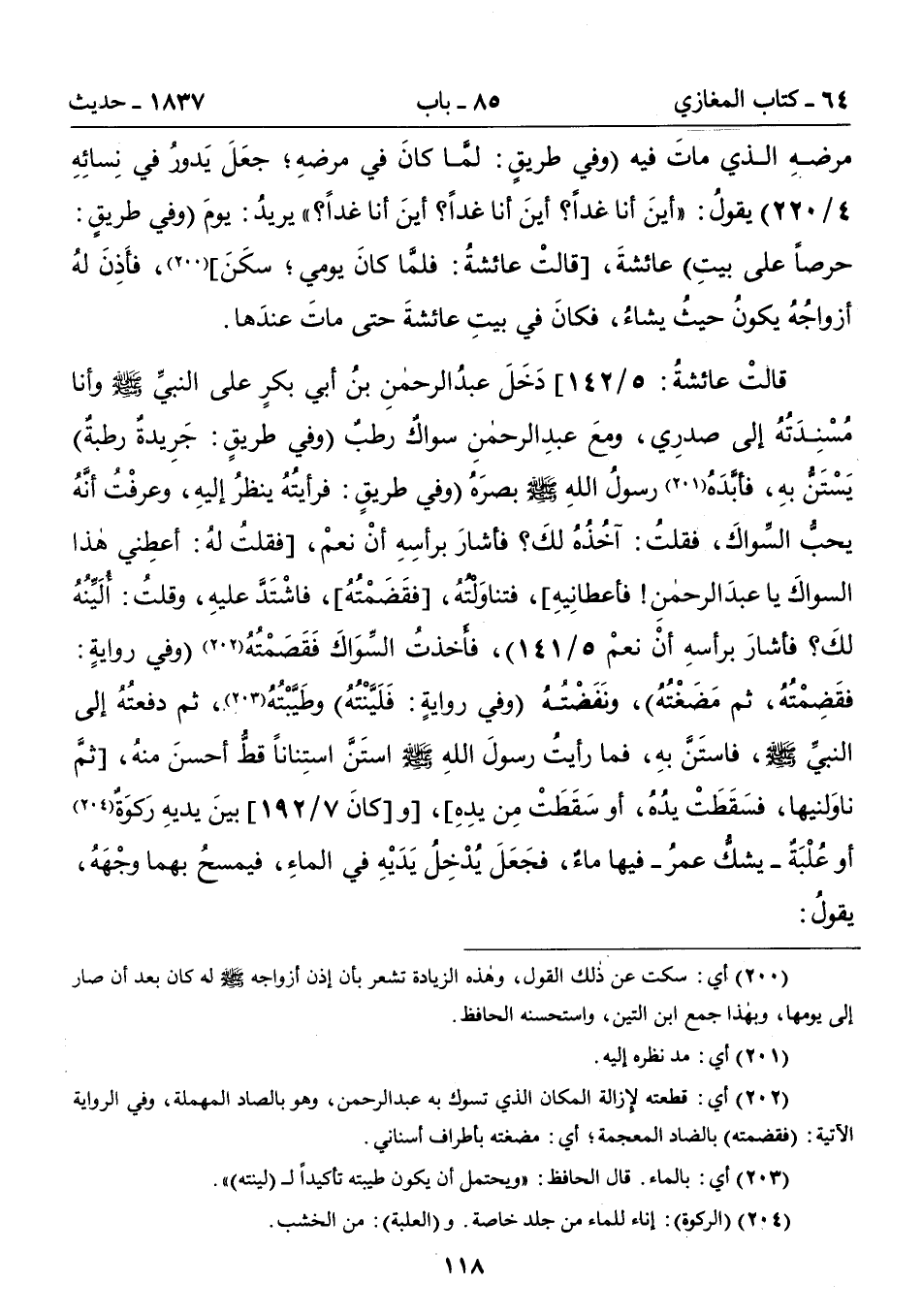قالتْ عائشةُ: 5/ 142] دَخَلَ عَبْدُ الرَّحْمَنِ بْنُ أَبِى بَكْرٍ عَلَى النَّبِيِّ - صلى الله عليه وسلم - وَأَنَا مُسْنِدَتُهُ إِلَى صَدْرِى، وَمَعَ عَبْدِ الرَّحْمَنِ سِوَاكٌ رَطْبٌ (وفى طريقٍ: جَرِيدةٌ رطبةٌ) يَسْتَنُّ بِهِ، فَأَبَدَّهُ (201) رَسُولُ اللَّهِ - صلى الله عليه وسلم - بَصَرَهُ (وفى طريقٍ: فَرَأَيْتُهُ يَنْظُرُ إِلَيْهِ، وَعَرَفْتُ أَنَّهُ يُحِبُّ السِّوَاكَ، فَقُلْتُ: آخُذُهُ لَكَ؟ فَأَشَارَ بِرَأْسِهِ أَنْ نَعَمْ، [فقلتُ لهُ: أعطِنى هذا السواكَ يا عبدَ الرحمنِ! فأعطانِيةِ] , فَتَنَاوَلْتُهُ , [فقَضَمْتُهُ] , فَاشْتَدَّ عَلَيْهِ، وَقُلْتُ: أُلَيِّنُهُ لَكَ؟ فَأَشَارَ بِرَأْسِهِ أَنْ نَعَمْ 5/ 141)، فَأخذتُ السِّوَاكَ فَقَصَمْتُهُ (202) (وفي روايةٍ: فقَضِمْتُهُ , ثم مَضَغْتُهُ) , (وفى روايةٍ: فَلَيَّنْتُهُ) وطَيَّبْتُهُ (203) , ثُمَّ دَفَعْتُهُ إِلَى النَّبِيِّ - صلى الله عليه وسلم -، فَاسْتَنَّ بِهِ، فَمَا رَأَيْتُ رَسُولَ اللَّهِ - صلى الله عليه وسلم - اسْتَنَّ اسْتِنَانًا قَطُّ أَحْسَنَ مِنْهُ , [ثُمَّ نَاوَلَنِيهَا فَسَقَطَتْ يَدُهُ، أَوْ سَقَطَتْ مِنْ يَدِهِ] , [و [كانَ 7/ 192] بينَ يديهِ رَكوَةُ (204) أو عُلْبَةٌ -يشكُّ عمرُ- فيها ماءٌ , فجَعَلَ يُدْخِلُ يَدَيْهِ في الماءِ, فيمسحُ بهما وجْهَهُ , يقولُ: