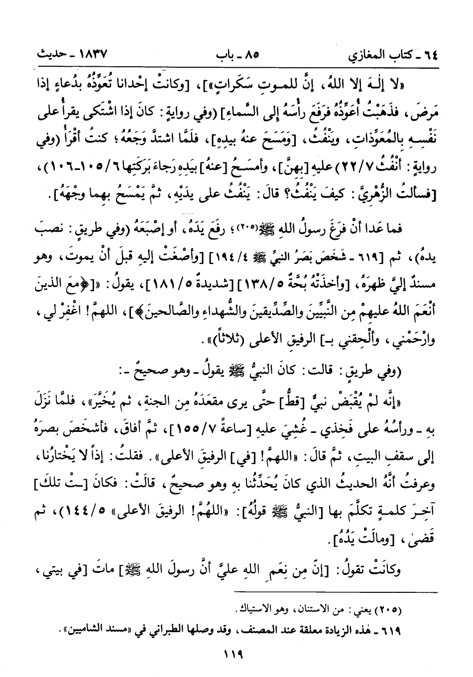 فما عَدا أنْ فرَغَ رسولُ الله - صلى الله عليه وسلم - (205)؛ رفَعَ يَدَهُ , أو إصْبَعَهُ (وفي طريقٍ: نصبَ يدهُ , ثم [619 - شَخَصَ بَصَرُ النبىِّ - صلى الله عليه وسلم - 4/ 194] [وأصْغَتْ إليهِ قبلَ أنْ يموتَ , وهو مسندٌ إلىَّ ظهره , [وأخذَتْهُ بُحَّةٌ 5/ 138] [شديدةٌ 5/ 181] , يقول: {معَ الذينَ أَنْعَمَ اللَّهُ عَلَيْهِمْ مِنَ النَّبِيِّينَ وَالصِّدِّيقِينَ وَالشُّهَدَاءِ وَالصَّالِحِينَ} , اللهمَّ! اغْفرْ لى , وارْحَمْنى , وألْحِقني بـ] الرفيقِ الأعلى (ثلاثاً) ".