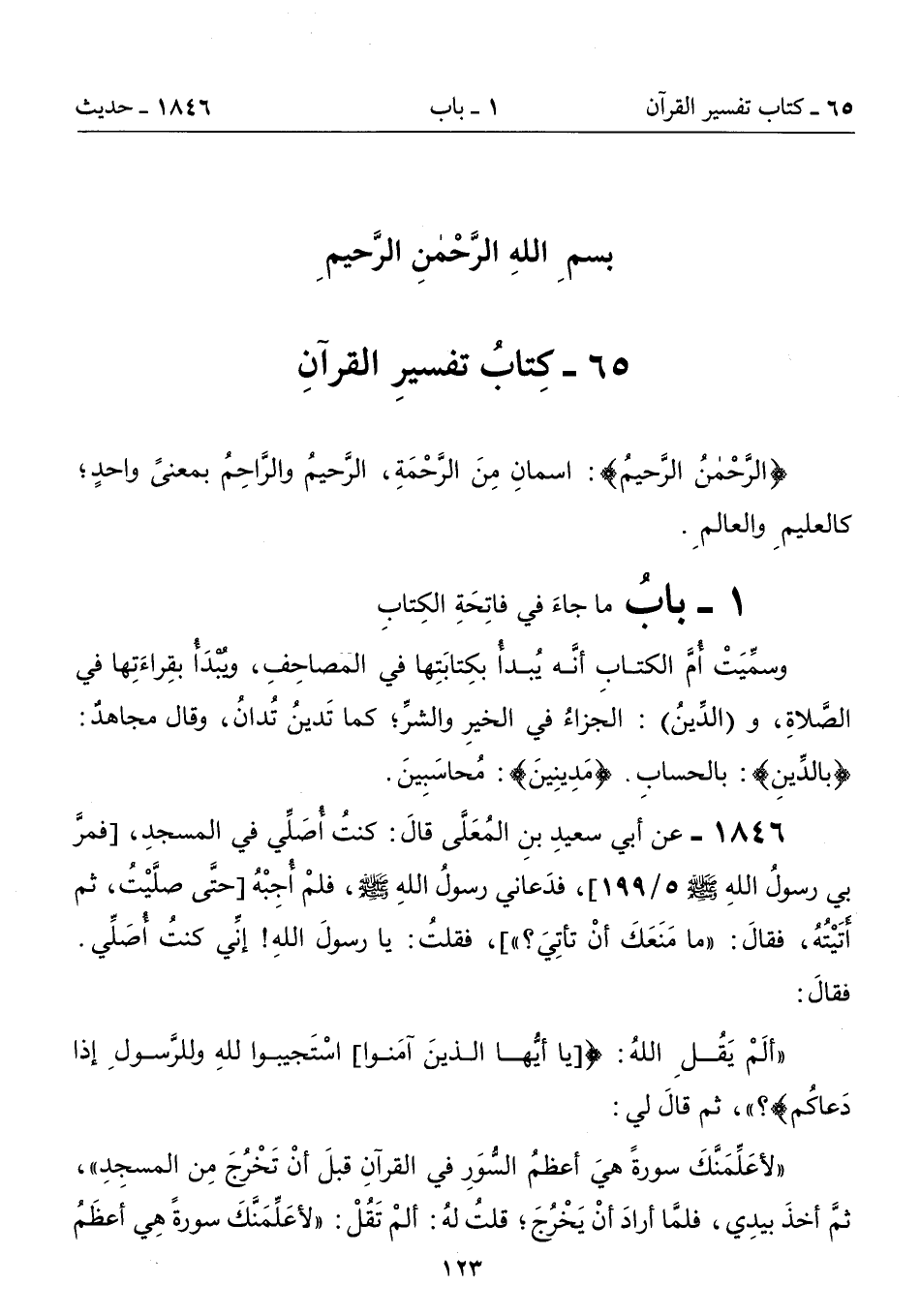 و1846 - عَنْ أَبِى سَعِيدِ بْنِ الْمُعَلَّى قَالَ: كُنْتُ أُصَلِّى فِى الْمَسْجِدِ , [فمرَّ بى رسولُ اللهِ - صلى الله عليه وسلم - 5/ 199]، فَدَعَانِى رَسُولُ اللَّهِ - صلى الله عليه وسلم -، فَلَمْ أُجِبْهُ، [حتىَّ صلَّيْتُ , ثم أَتَيْتُهُ , فقالَ "ما مَنَعَكَ أنْ تأتِىَ؟ "]، فَقُلْتُ: يَا رَسُولَ اللَّهِ! إِنِّى كُنْتُ أُصَلِّى. فَقَالَ: