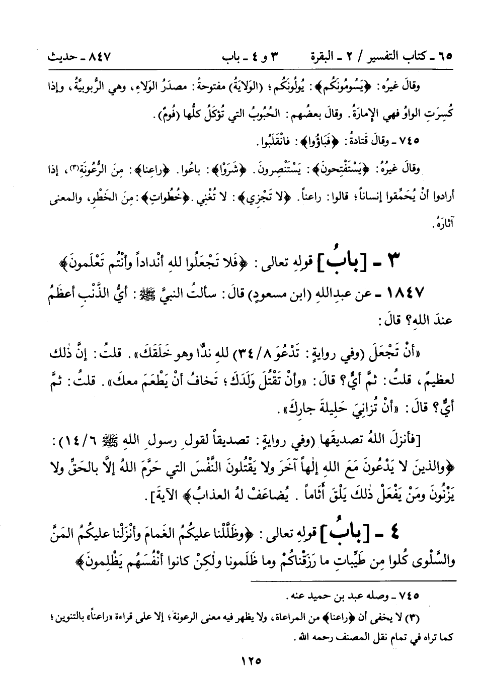 "أنْ تَجْعَلَ (وفي روايةٍ: تَدْعُوَ 8/ 34) للهِ ندًّا وهو خَلَقَكَ". قلتُ: إنَّ ذلك لعظيمٌ، قلتُ: ثمَّ أيٌّ؟ قالَ: "وأنْ تَقْتُلَ وَلَدَكَ؛ تَخافُ أنْ يَطْعَمَ معكَ". قلتُ: ثمَّ أيٌّ؟ قالَ: "أنْ تُزانِيَ حَلِيلةَ جارِكَ".