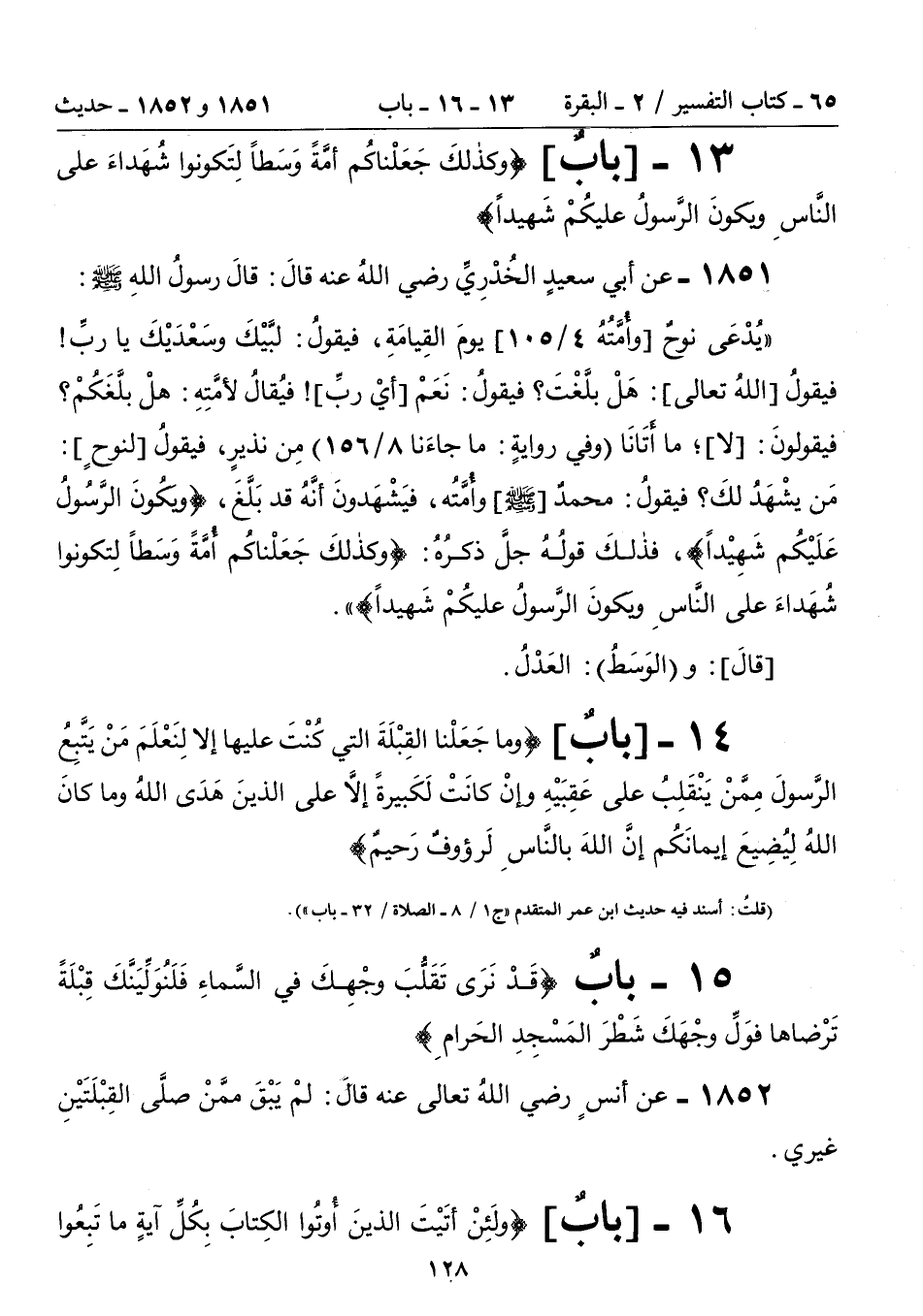 13 - {بابٌ} {وَكَذَلِكَ جَعَلْنَاكُمْ أُمَّةً وَسَطًا لِتَكُونُوا شُهَدَاءَ عَلَى النَّاسِ وَيَكُونَ الرَّسُولُ عَلَيْكُمْ شَهِيدًا}
