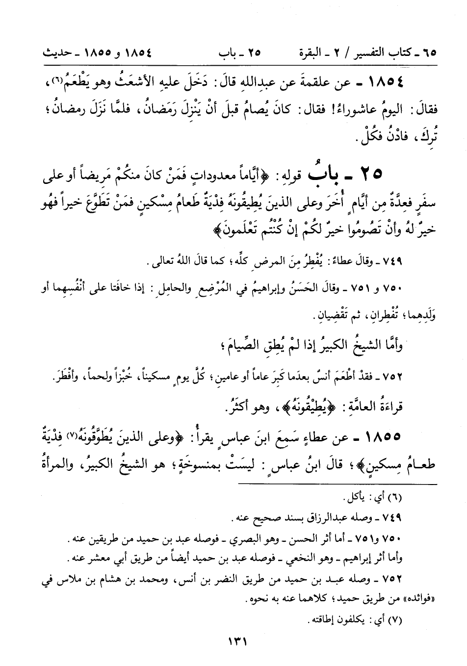 1855 - عن عطاءٍ سَمعَ ابنَ عباسٍ يقرأُ: {وَعَلَى الَّذِينَ يُطَوَّقُونَهُ (7) فِدْيَةٌ طَعَامُ مِسْكِينٍ}؛ قَالَ: ابْنُ عَبَّاسٍ: لَيْسَتْ بِمَنْسُوخَةٍ؛ هُوَ الشَّيْخُ الْكَبِيرُ وَالْمَرْأَةُ