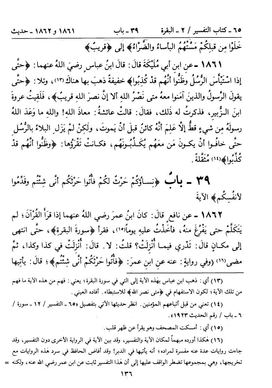 1862 - عَنْ نَافِعٍ قَالَ: كَانَ ابْنُ عُمَرَ - رضى الله عنهما - إِذَا قَرَأَ الْقُرْآنَ؛ لَمْ يَتَكَلَّمْ حَتَّى يَفْرُغَ مِنْهُ، فَأَخَذْتُ عَلَيْهِ يَوْمًا (15)، فَقَرَأَ {سُورَةَ الْبَقَرَةِ}، حَتَّى انْتَهَى إِلَى مَكَانٍ قَالَ: تَدْرِى فِيمَا أُنْزِلَتْ؟ قُلْتُ: لاَ. قَالَ: أُنْزِلَتْ فِى كَذَا وَكَذَا , ثُمَّ مَضَى (16) (وفى روايةٍ: عنه عنِ ابنِ عمرَ: {فَأْتُوا حَرْثَكُمْ أَنَّى شِئْتُمْ}؛ قالَ: يأتِيها