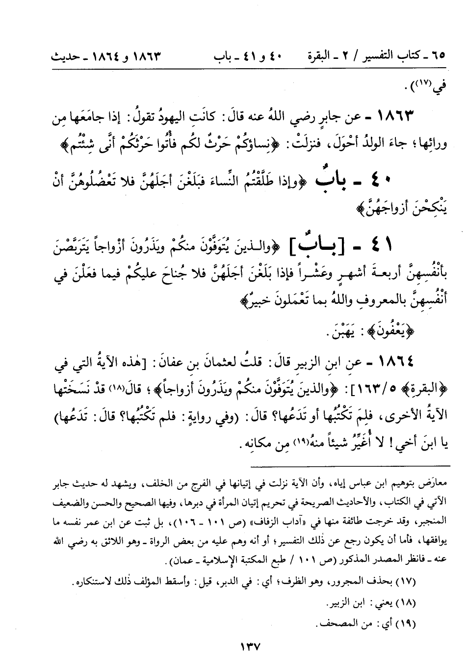 1864 - قَالَ: ابْنُ الزُّبَيْرِ قال: قُلْتُ لِعُثْمَانَ بْنِ عَفَّانَ: [هذه الآيةُ التي في {البقرةِ} 5/ 163]: {وَالَّذِينَ يُتَوَفَّوْنَ مِنْكُمْ وَيَذَرُونَ أَزْوَاجًا)؛ قَالَ: (18) قَدْ نَسَخَتْهَا الآيَةُ الأُخْرَى , فَلِمَ تَكْتُبُهَا أَوْ تَدَعُهَا؟ قَالَ: (وفي روايةٍ: فلم تَكْتُبُها؟ قال: تَدَعُها) يَا ابْنَ أَخِي، لاَ أُغَيِّرُ شَيْئًا مِنْهُ (19) مِنْ مَكَانِهِ.