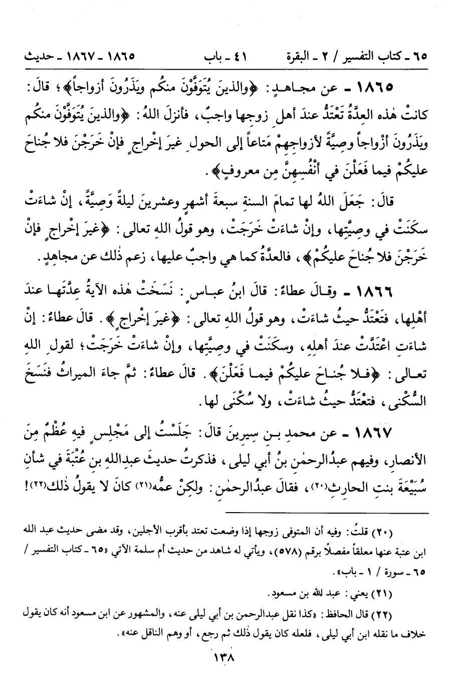 1867 - عَنْ مُحَمَّدِ بْنِ سِيرِينَ قَالَ: جَلَسْتُ إِلَى مَجْلِسٍ فِيهِ عُظْمٌ مِنَ الأَنْصَارِ، وَفِيهِمْ عَبْدُ الرَّحْمَنِ بْنُ أَبِى لَيْلَى، فَذَكَرْتُ حَدِيثَ عَبْدِ اللَّهِ بْنِ عُتْبَةَ فِى شَأْنِ سُبَيْعَةَ بِنْتِ الْحَارِثِ (20)، فَقَالَ عَبْدُ الرَّحْمَنِ: وَلَكِنَّ عَمَّهُ (21) كَانَ لاَ يَقُولُ ذَلِكَ (22)!