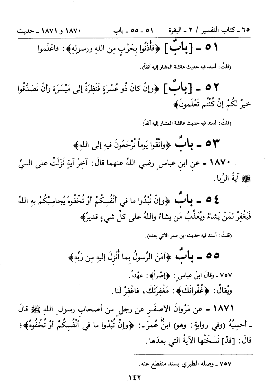 1871 - عن مَرْوانَ الأصفَرِ عن رجلٍ من أصحاب رسولِ اللهِ - صلى الله عليه وسلم - قالَ -أحسِبُهُ (وفي روايةٍ: وهو) ابنُ عُمرَ-: {وإنْ تُبْدُوا ما فيَ أنْفُسِكُمْ أوْ تُخْفُوهُ}؛ قالَ: [قدْ] نَسَخَتْها الآيةُ التي بعدَها.
