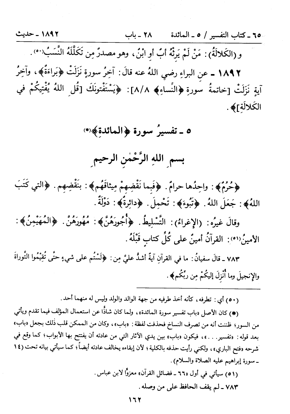 (*) كان الأصل "باب تفسير سورة المائدة"، ولما كان شاذًّا عن استعمال المؤلف فيما تقدم ويأتي من السور؛ ظننت أنه من تصرف النساخ فحذفت لفظة: "باب"، وكان من الممكن قلب ذلك بجعل "باب" بعد قوله: "تفسير ... "، فيكون "باب" بين يدي الآثار التي من عادته أن يفتتح بها الأبواب؛ كما وقع في شرحه "فتح الباري"، ولكني رأيت حذفه بالكلية؛ لأن إبقاءه يخالف عادته أيضاً؛ كما سيأتي بيانه تحت (14 - سورة إبراهيم عليه الصلاة والسلام).