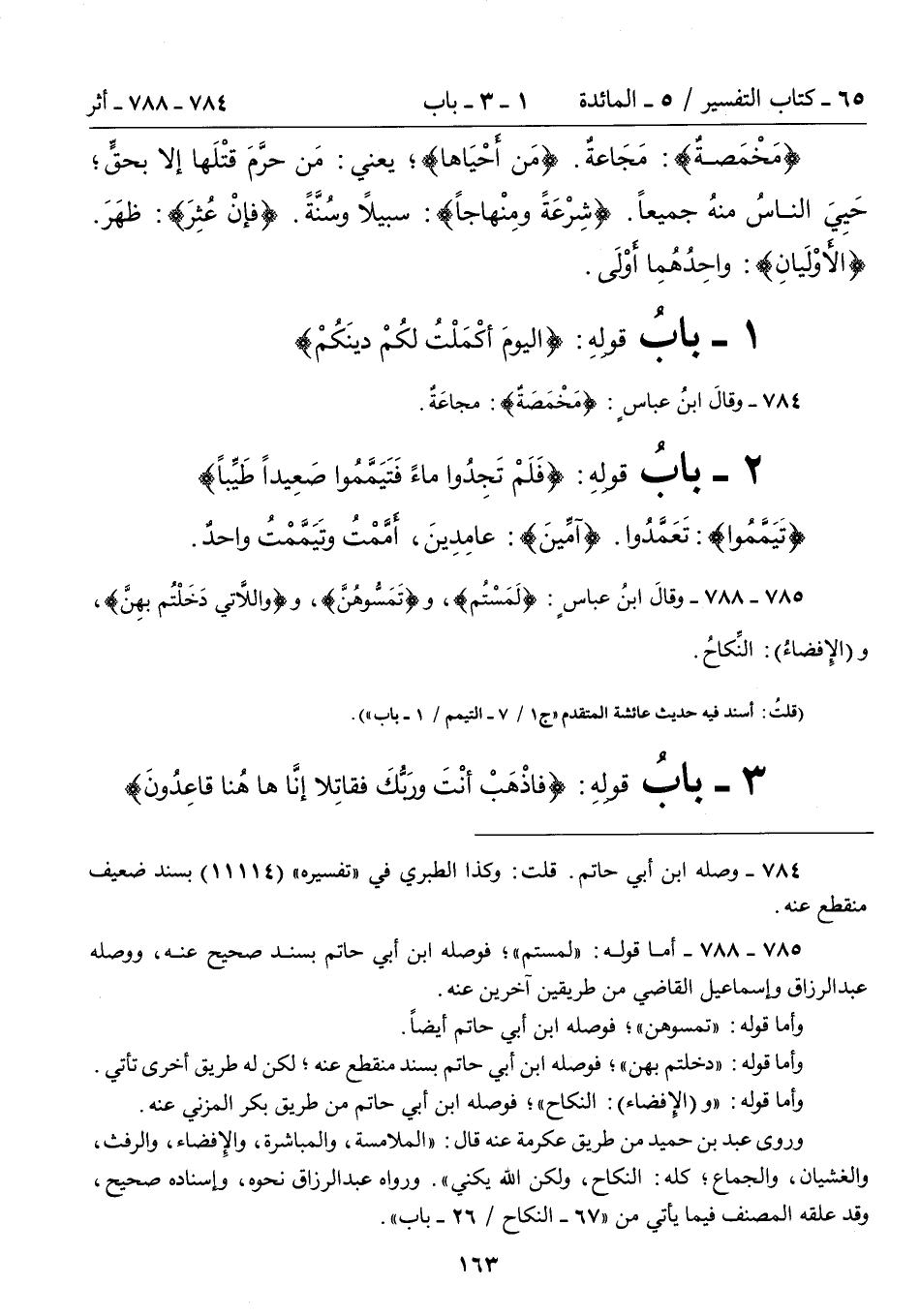 785 - 788 - أما قوله: "لمستم"؛ فوصله ابن أبي حاتم بسند صحيح عنه، ووصله عبد الرزاق وإسماعيل القاضي من طريقين آخرين عنه.
