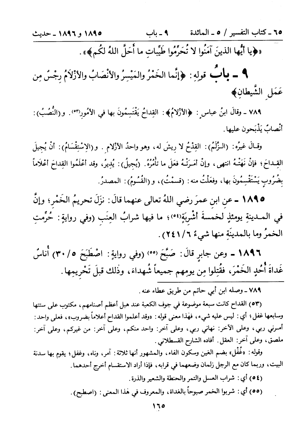 789 - وقالَ ابنُ عباس: {الأزْلامُ}: القِداحُ يَقْتَسِمُونَ بها في الأمُورِ (35). و (النُّصُبُ): أنْصابٌ يَذْبَحون عليها.