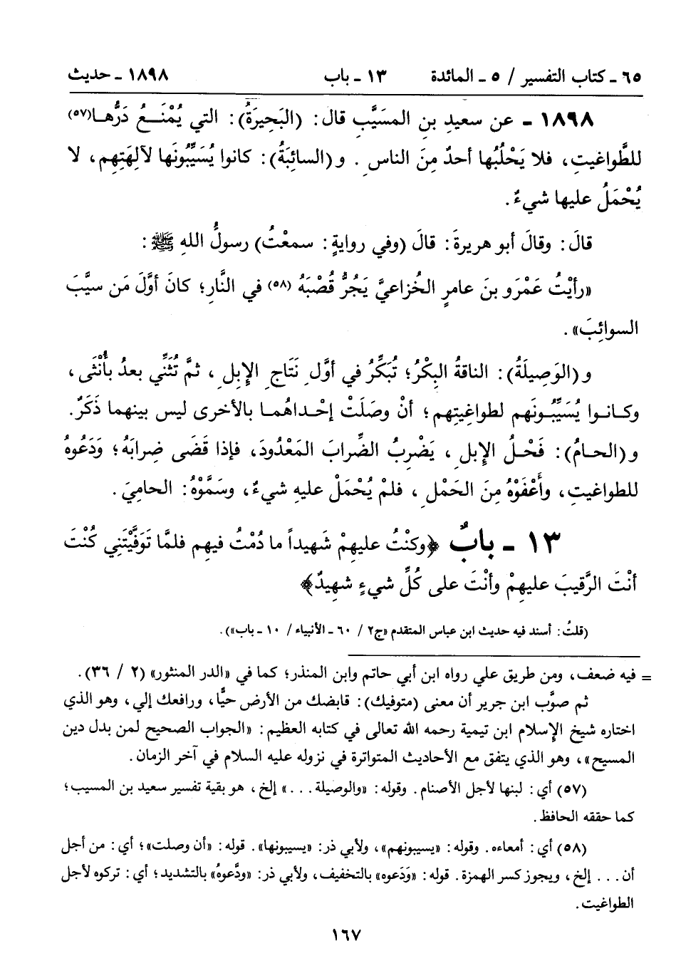 1898 - عن سعيدِ بنِ المسَيَّبِ قال: (البَحِيرَةُ): التي يُمْنَعُ دَرُّها (57) للطَّواغيتِ، فلا يَحْلُبُها أحدٌ مِنَ الناسِ. و (السائِبَةُ): كانوا يُسَيِّبُونَها لآلِهَتِهِم، لا يُحْمَلُ عليها شيءٌ.