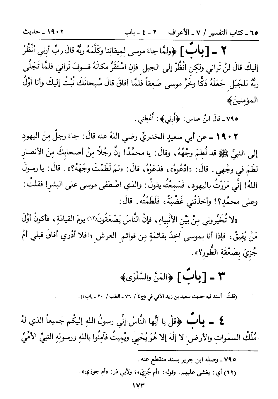 2 - [بابٌ] {وَلَمَّا جَاءَ مُوسَى لِمِيقَاتِنَا وَكَلَّمَهُ رَبُّهُ قَالَ رَبِّ أَرِنِي أَنْظُرْ إِلَيْكَ قَالَ لَنْ تَرَانِي وَلَكِنِ انْظُرْ إِلَى الْجَبَلِ فَإِنِ اسْتَقَرَّ مَكَانَهُ فَسَوْفَ تَرَانِي فَلَمَّا تَجَلَّى رَبُّهُ لِلْجَبَلِ جَعَلَهُ دَكًّا وَخَرَّ مُوسَى صَعِقَّا فَلَمَّا أَفَاقَ قَالَ سُبْحَانَكَ تُبْتُ إِلَيْكَ وَأَنَا أَوَّلُ الْمُؤْمِنِينَ}