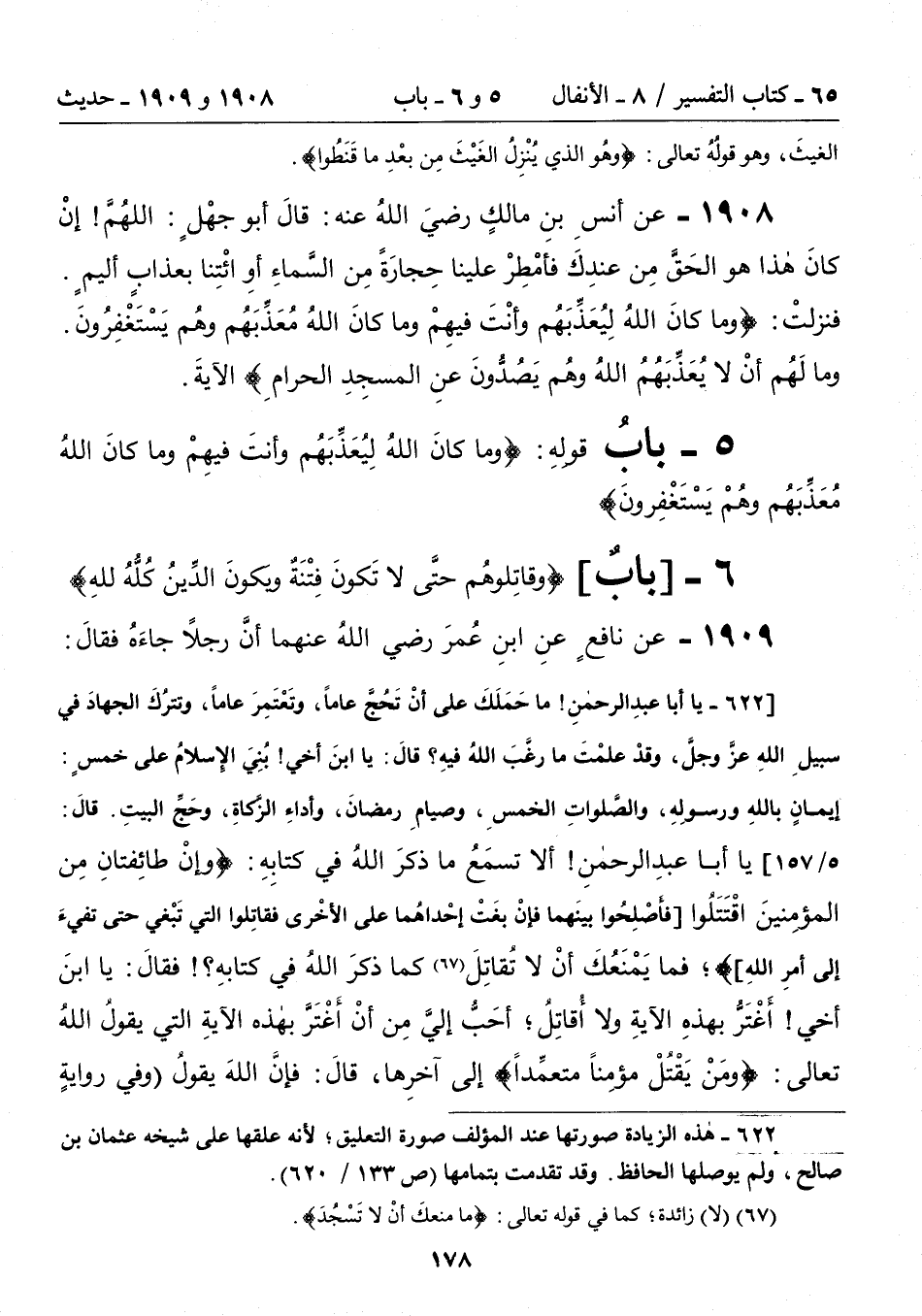 1909 - عن نافعٍ عنِ ابنِ عُمرَ رضي اللهُ عنهما أنَّ رجلًا جاءَهُ فقالَ: [622 - يا أبا عبدِ الرحمنِ! ما حَمَلَكَ على أنْ تَحُجَّ عاماً، وتَعْتَمِرَ عاماً، وتترُكَ الجهادَ في سبيلِ اللهِ عزَّ وجلَّ، وقدْ علمْتَ ما رغَّبَ اللهُ فيهِ؟ قالَ: يا ابنَ أخي! بُنِيَ الِإسلامُ على خمسٍ: إِيمَانٍ بِاللَّهِ وَرَسُولِهِ، وَالصَّلاَةِ الْخَمْسِ، وَصِيَامِ رَمَضَانَ، وَأَدَاءِ الزَّكَاةِ، وَحَجِّ الْبَيْتِ. قالَ: 5/ 157] يا أبا عبدِ الرحمنِ! ألا تسمَعُ ما ذكرَ اللهُ في كتابِهِ: {وَإِنْ طَائِفَتَانِ مِنَ الْمُؤْمِنِينَ اقْتَتَلُوا [فَأَصْلِحُوا بَيْنَهُمَا فَإِنْ بَغَتْ إِحْدَاهُمَا عَلَى الْأُخْرَى فَقَاتِلُوا الَّتِي تَبْغِي حَتَّى تَفِيءَ إِلَى أَمْرِ اللَّهِ]}؛ فما يَمْنَعُكَ أنْ لا تُقاتِلَ (67) كما ذكرَ اللهُ في كتابه؟! فَقَالَ: يَا ابْنَ أَخِى! أَغْتَرُّ بِهَذِهِ الآيَةِ وَلاَ أُقَاتِلُ؛ أَحَبُّ إِلَيَّ مِنْ أَنْ أَغْتَرَّ بِهَذِهِ الآيَةِ الَّتِى يَقُولُ اللَّهُ تَعَالَى: {وَمَنْ يَقْتُلْ مُؤْمِنًا مُتَعَمِّدًا} إِلَى آخِرِهَا. قَالَ: فَإِنَّ اللَّهَ يَقُولُ (وفى روايةٍ