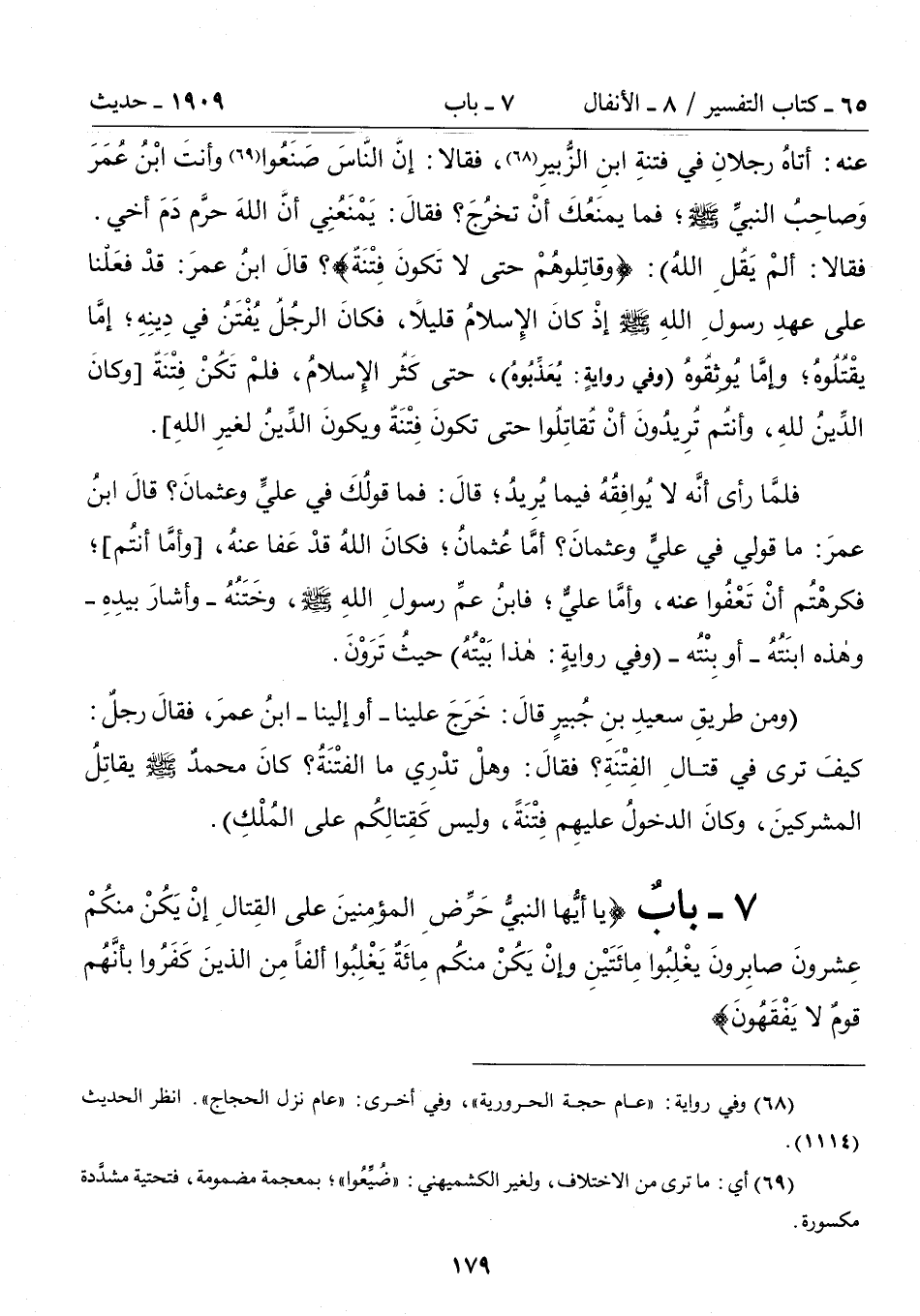 (ومن طريقِ سَعِيدُ بْنُ جُبَيْرٍ قَالَ: خَرَجَ عَلَيْنَا -أَوْ إِلَيْنَا- ابْنُ عُمَرَ، فَقَالَ رَجُلٌ: كَيْفَ تَرَى فِى قِتَالِ الْفِتْنَةِ؟ فَقَالَ: وَهَلْ تَدْرِى مَا الْفِتْنَةُ؟ كَانَ مُحَمَّدٌ - صلى الله عليه وسلم - يُقَاتِلُ الْمُشْرِكِينَ، وَكَانَ الدُّخُولُ عَلَيْهِمْ فِتْنَةً، وَلَيْسَ كَقِتَالِكُمْ عَلَى الْمُلْكِ).