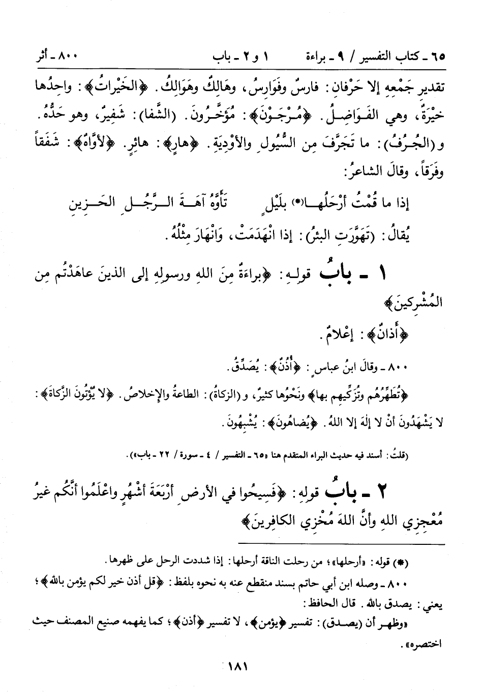 1 - بابُ قولهِ: {براءَةٌ مِنَ اللهِ ورسولهِ إلى الذينَ عاهَدْتم مِن المُشْرِكينَ}