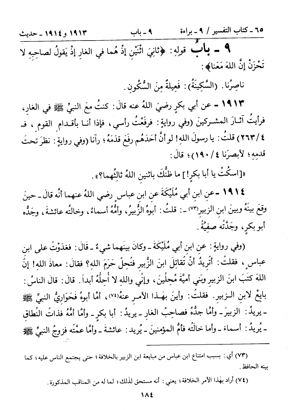 1914 - عنِ ابنِ أبي مُلَيْكَةَ عنِ ابنِ عباسٍ رضي اللهُ عنهما أنَّه قالَ -حِينَ وَقَعَ بَيْنَهُ وَبَيْنَ ابْنِ الزُّبَيْرِ (73) - قُلْتُ: أَبُوهُ الزُّبَيْرُ، وَأُمُّهُ أَسْمَاءُ، وَخَالَتُهُ عَائِشَةُ، وَجَدُّهُ أَبُو بَكْرٍ، وَجَدَّتُهُ صَفِيَّةُ.