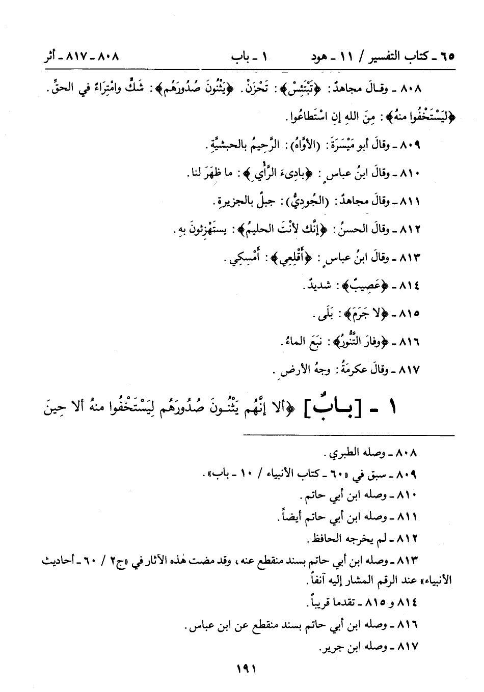 1 - [بابٌ] {أَلَا إِنَّهُمْ يَثْنُونَ صُدُورَهُمْ لِيَسْتَخْفُوا مِنْهُ أَلَا حِينَ}