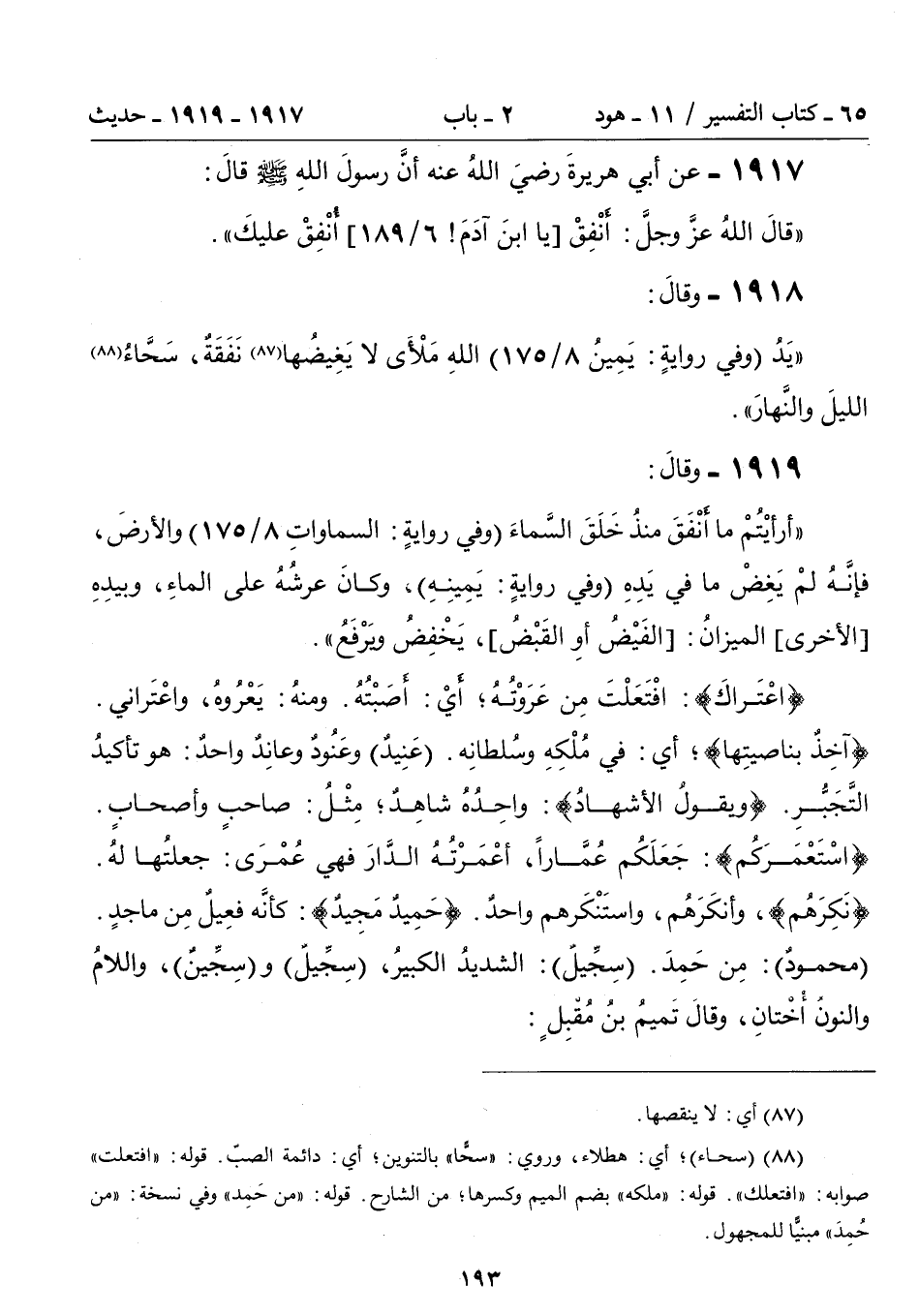 "يَدُ (وفي روايةٍ: يَمِينُ 8/ 175) اللهِ مَلْأَى لا يَغِيضُها (87) نَفَقَةٌ، سَحَّاءُ (88) الليلَ والنَّهارَ".