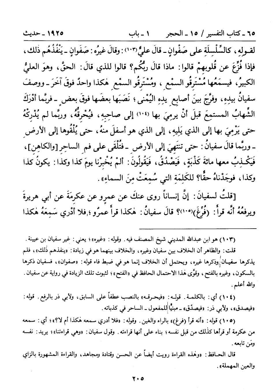 [قلتُ لسفيانَ: إنَّ إنساناً روى عنكَ عن عمرٍو عن عكرِمَةَ عن أبي هريرةَ ويرفعُهُ أنَّه قرأ: [فُرِّغَ] (105)؟ قالَ سفيانُ: هكذا قرأَ عمرٌو؛ فلا أدْري سَمِعَهُ هكذا