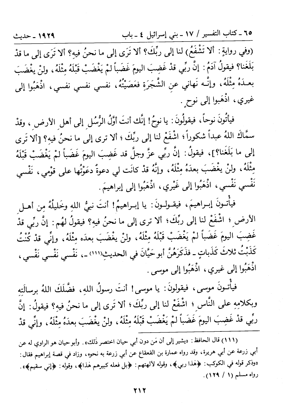 فَيَأْتُونَ إِبْرَاهِيمَ، فَيَقُولُونَ: يَا إِبْرَاهِيمُ! أَنْتَ نَبِىُّ اللَّهِ وَخَلِيلُهُ مِنْ أَهْلِ الأَرْضِ؛ اشْفَعْ لَنَا إِلَى رَبِّكَ؛ أَلاَ تَرَى إِلَى مَا نَحْنُ فِيهِ؟ فَيَقُولُ لَهُمْ: إِنَّ رَبِّى قَدْ غَضِبَ الْيَوْمَ غَضَبًا لَمْ يَغْضَبْ قَبْلَهُ مِثْلَهُ، وَلَنْ يَغْضَبَ بَعْدَهُ مِثْلَهُ, وَإِنِّى قَدْ كُنْتُ كَذَبْتُ ثَلاَثَ كَذَبَاتٍ -فَذَكَرَهُنَّ أَبُو حَيَّانَ فِى الْحَدِيثِ (111) -, نَفْسِى نَفْسِى نَفْسِى، اذْهَبُوا إِلَى غَيْرِى اذْهَبُوا إِلَى مُوسَى.