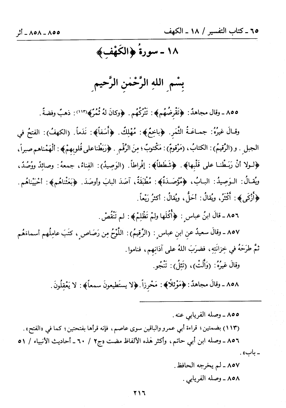 855 - وقال مجاهدٌ: {تَقْرِضُهُم}: تَتْرُكُهُم. {وكانَ لهُ ثُمُرٌ} (113): ذهبٌ وفضةٌ.