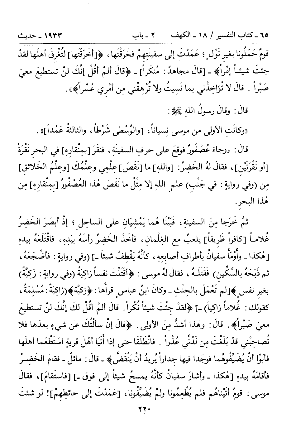 ثمَّ خَرَجا مِنَ السفينةِ، فَبَيْنَا هُما يَمْشِيَانِ على الساحِلِ؛ إذْ أبصَرَ الخَضِرُ غُلاماً [كافراً ظَرِيفاً]، يلعبُ مع الغِلْمانِ، فأخَذَ الخَضِرُ رأسَهُ بيَدِهِ، فاقْتَلَعَهُ بيدهِ [هكذا -وأوْمَأَ سفيانُ بأطرافِ أصابِعِهِ، كأنَّهُ يَقْطِفُ شيئاَ-] [وفي روايةٍ: فأضْجَعَهُ، ثم ذَبَحَهُ بالسِّكِّينِ] فَقَتَلَهُ، فقالَ لهُ موسى: {أقَتَلْتَ نفساً زاكِيَةً (وفي روايةٍ: زَكِيَّةً) بغيرِ نفسٍ} [لم تَعْمَلْ بالحِنْثِ -وكان ابنُ عباسٍ قرأَها: {زكيَّة} (زاكِيَةً: مُسْلِمَةً، كقولك: غُلاماً زاكِياَ) -] {لقدْ جِئْتَ شيئاً نُكْراً. قالَ ألمْ أقُلْ لكَ إنَّكَ لنْ تستطيعَ معيَ صَبْراً}. قالَ: وهذا أشدُّ مِنَ الأولى. {قَالَ إِنْ سَأَلْتُكَ عَنْ شَيْءٍ بَعْدَهَا فَلَا تُصَاحِبْنِي قَدْ بَلَغْتَ مِنْ لَدُنِّي عُذْرًا. فَانْطَلَقَا حَتَّى إِذَا أَتَيَا أَهْلَ قَرْيَةٍ اسْتَطْعَمَا أَهْلَهَا فَأَبَوْا أَنْ يُضَيِّفُوهُمَا فَوَجَدَا فِيهَا جِدَارًا يُرِيدُ أَنْ يَنْقَضَّ} -قالَ: مائلٌ- فقامَ الخَضِرُ فأقامَهُ بيدهِ [هكذا -وأشارَ سفيانُ كأنَّهُ يمسحُ شيئاً إلى فوق-] [فاستَقامَ]، فقالَ موسى: قومٌ أتَيْناهُم فلم يُطْعِمُونا ولمْ يُضَيِّفُونا، [عَمَدْتَ إلى حائطِهِمْ]! لو شئتَ
