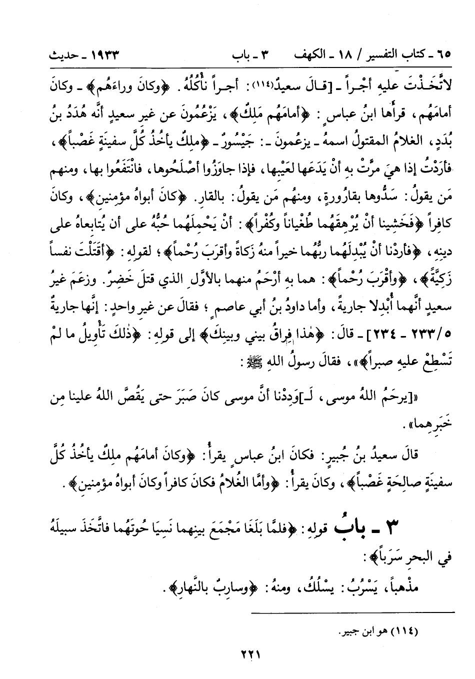 قالَ سعيدُ بنُ جُبيرٍ: فكانَ ابنُ عباسٍ يقرأ: {وكانَ أمامَهُم ملِكٌ يأخُذُ كُلَّ سفينَةٍ صالِحَةٍ غَصْباً}، وكانَ يقرأُ: {وأمَّا الغُلامُ فكانَ كافرًا وكانَ أبواهُ مؤمِنينِ}.