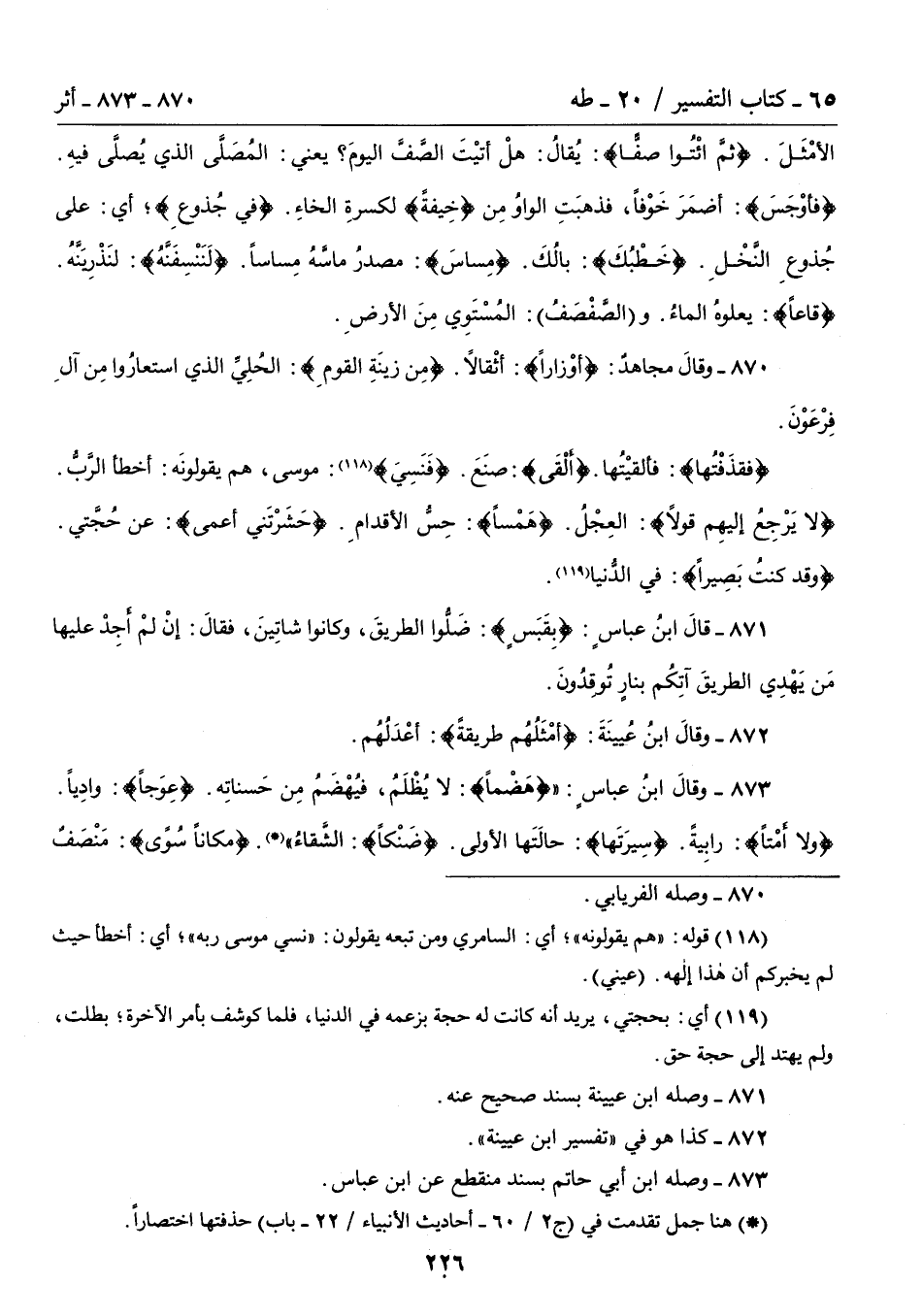 871 - قالَ ابنُ عباس: {بِقَبَسٍ}: ضَلُّوا الطريقَ، وكانوا شاتِينَ، فقالَ: إنْ لمْ أجِدْ عليها مَن يَهْدِي الطريقَ آتِكُم بنارٍ تُوقدُونَ.