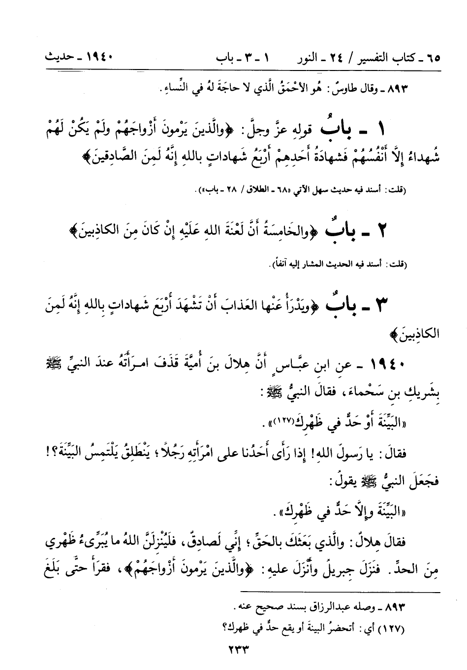 1 - بابُ قولهِ عزَّ وجلَّ: {وَالَّذِينَ يَرْمُونَ أَزْوَاجَهُمْ وَلَمْ يَكُنْ لَهُمْ شُهَدَاءُ إِلَّا أَنْفُسُهُمْ فَشَهَادَةُ أَحَدِهِمْ أَرْبَعُ شَهَادَاتٍ بِاللَّهِ إِنَّهُ لَمِنَ الصَّادِقِينَ}
