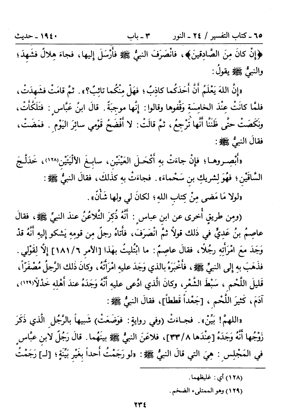 «أَبْصِرُوهَا؛ فَإِنْ جَاءَتْ بِهِ أَكْحَلَ الْعَيْنَيْنِ، سَابِغَ الأَلْيَتَيْنِ (128)، خَدَلَّجَ السَّاقَيْنِ؛ فَهْوَ لِشَرِيكِ بْنِ سَحْمَاءَ». فَجَاءَتْ بِهِ كَذَلِكَ، فَقَالَ النَّبِيُّ - صلى الله عليه وسلم -: