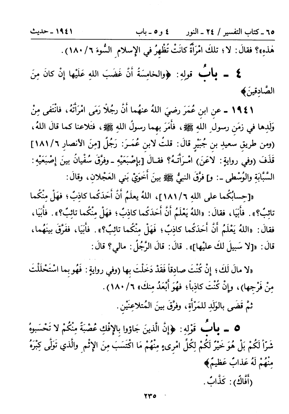 4 - بابُ قولهِ: {وَالْخَامِسَةَ أَنَّ غَضَبَ اللَّهِ عَلَيْهَا إِنْ كَانَ مِنَ الصَّادِقِينَ}