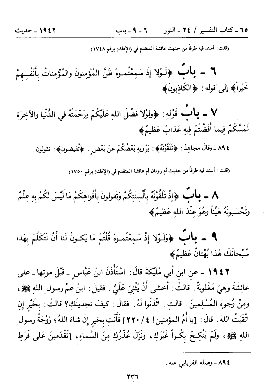 6 - بابٌ {لَوْلَا إِذْ سَمِعْتُمُوهُ ظَنَّ الْمُؤْمِنُونَ وَالْمُؤْمِنَاتُ بِأَنْفُسِهِمْ خَيْرًا} إلى قوله: {الكَاذِبونَ}