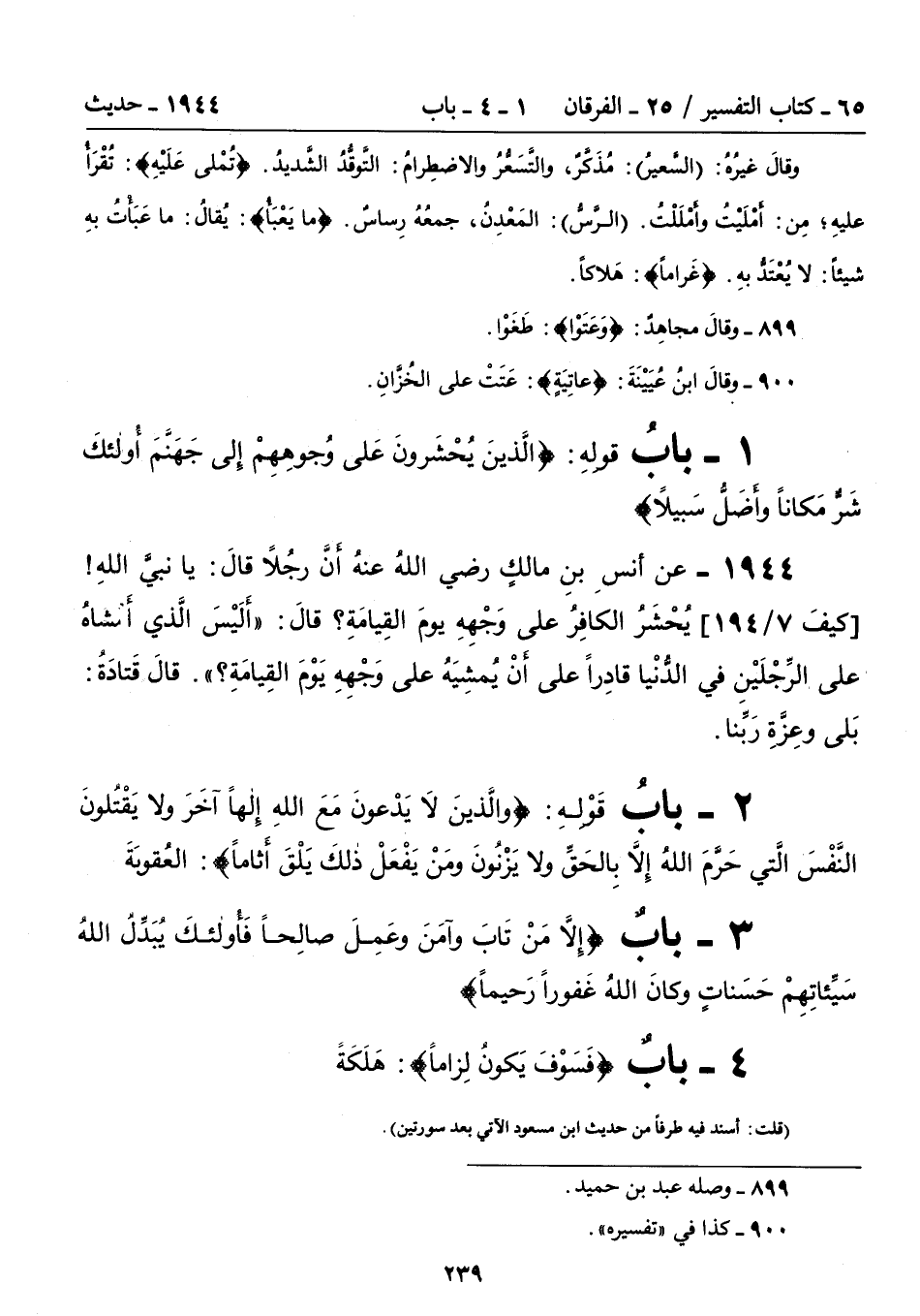 1 - بابُ قولِهِ: {الَّذِينَ يُحْشَرُونَ عَلَى وُجُوهِهِمْ إِلَى جَهَنَّمَ أُولَئِكَ شَرٌّ مَكَانًا وَأَضَلُّ سَبِيلًا}