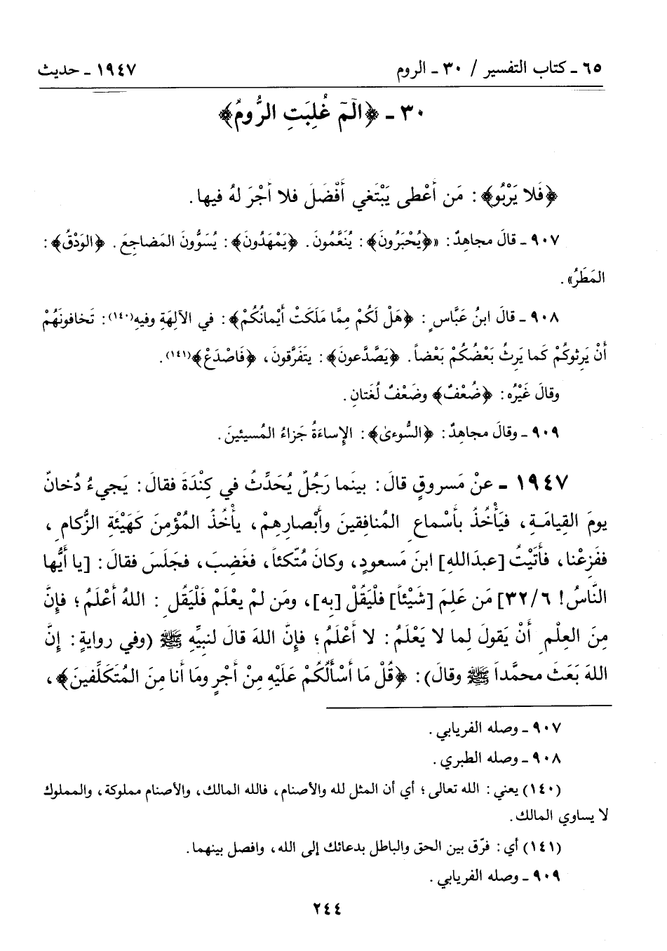908 - قَالَ ابْنُ عَبَّاسٍ: {هَلْ لَكُمْ مِمَّا مَلَكَتْ أَيْمَانُكُمْ}: فِى الآلِهَةِ وَفِيه (140): تَخَافُونَهُمْ أَنْ يَرِثُوكُمْ كَمَا يَرِثُ بَعْضُكُمْ بَعْضًا. {يَصَّدَّعُونَ}: يَتَفَرَّقُونَ، {فَاصْدَعْ} (141).