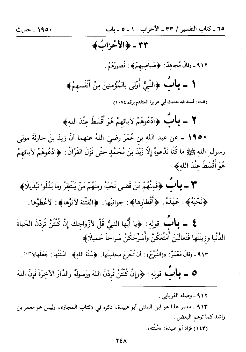 913 - وقالَ مَعْمَرٌ: " (التَّبَرُّجُ): أن تُخْرِجَ محاسِنَها. {سُنَّةَ اللهِ}: اسْتَنَّها: جَعَلَها" (143).