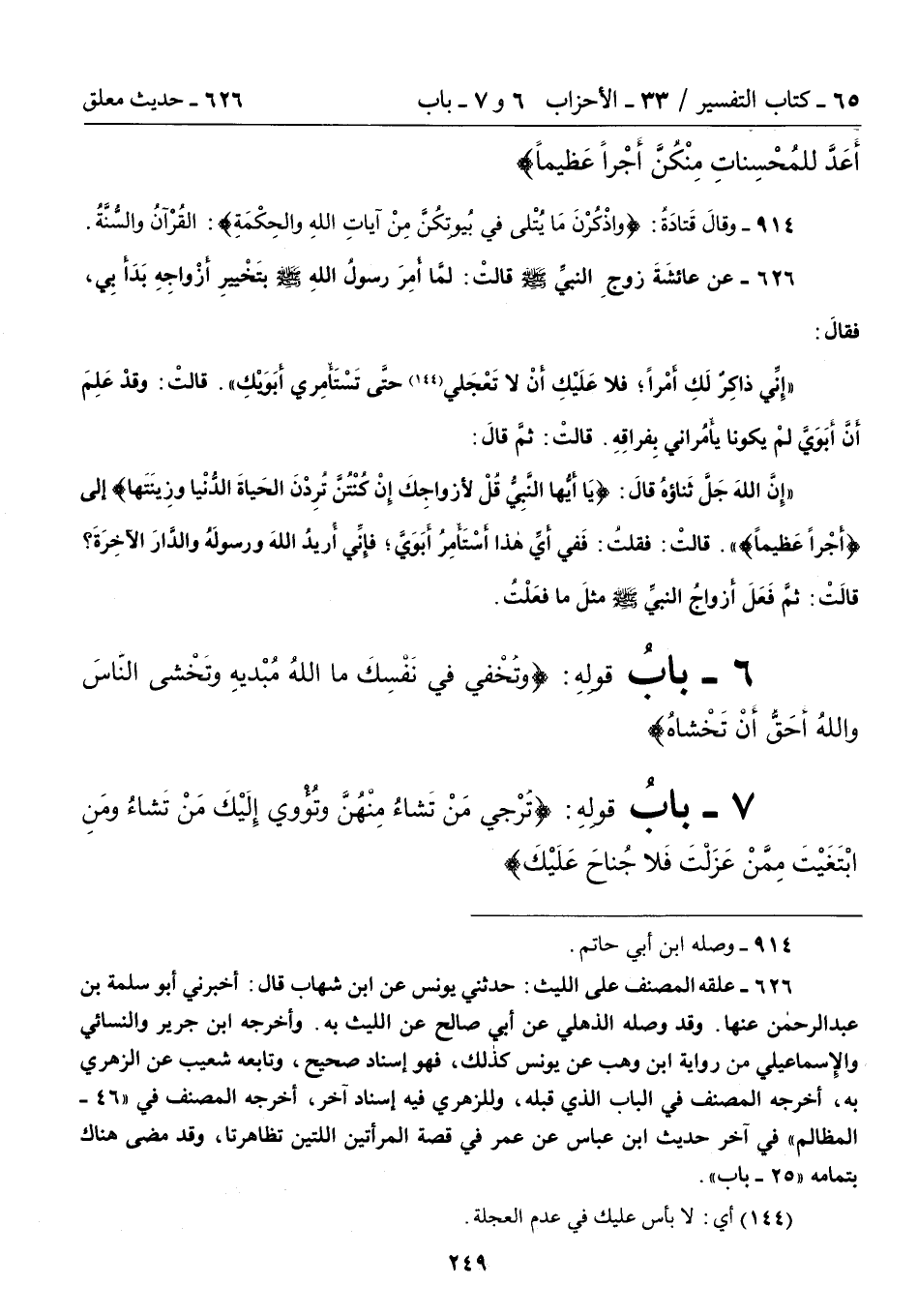626 - علقه المصنف على الليث: حدثني يونس عن ابن شهاب قال: أخبرني أبو سلمة بن عبد الرحمن عنها. وقد وصله الذهلي عن أبي صالح عن الليث به. وأخرجه ابن جرير والنسائي والِإسماعيلي من رواية ابن وهب عن يونس كذلك، فهو إسناد صحيح، وتابعه شعيب عن الزهري به، أخرجه المصنف في الباب الذي قبله، وللزهري فيه إسناد آخر، أخرجه المصنف في "46 - المظالم" في آخر حديث ابن عباس عن عمر في قصة المرأتين اللتين تظاهرتا، وقد مضى هناك بتمامه "25 - باب".